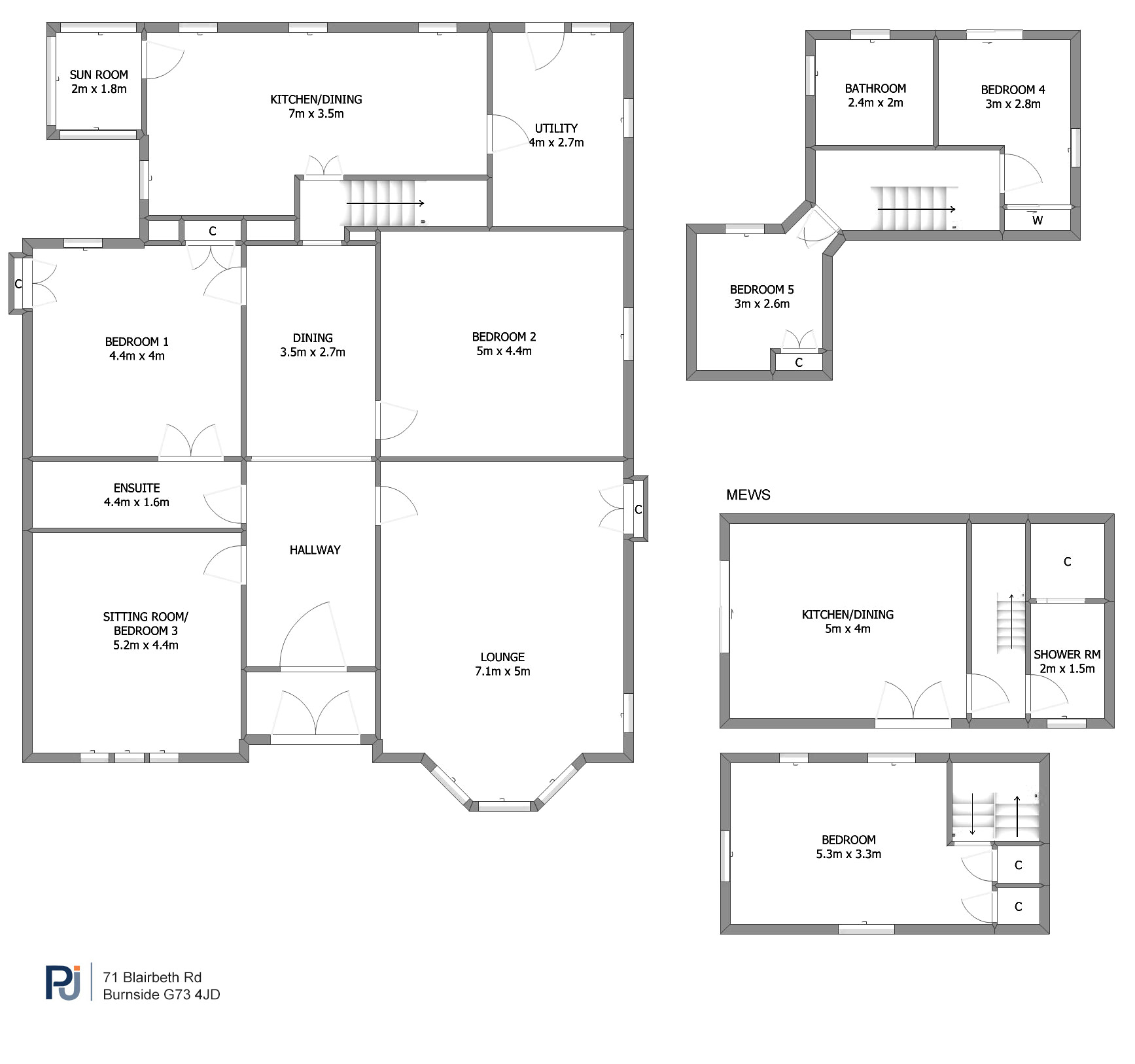 The detached stone mews cottage adds yet another layer of appeal – featuring accommodation across two floors, including a bright lounge with full-height window, an inner hall leading to a shower room and utility space, and an upper-level bedroom with fitted wardrobes. The cottage benefits from electric heating and double glazing (in the main).