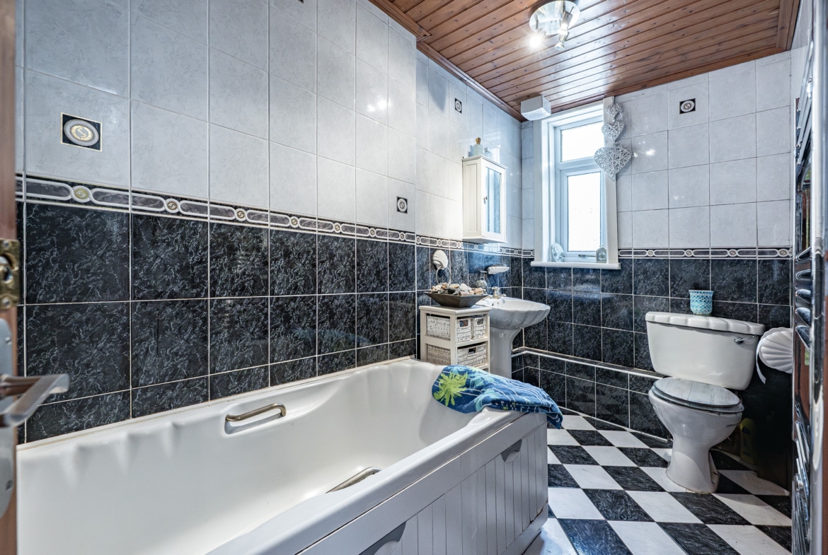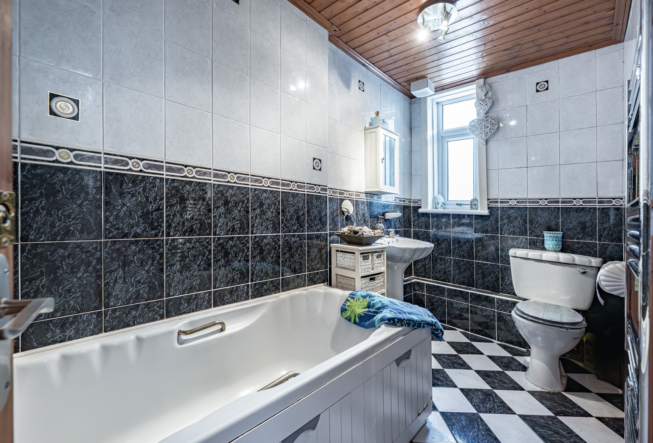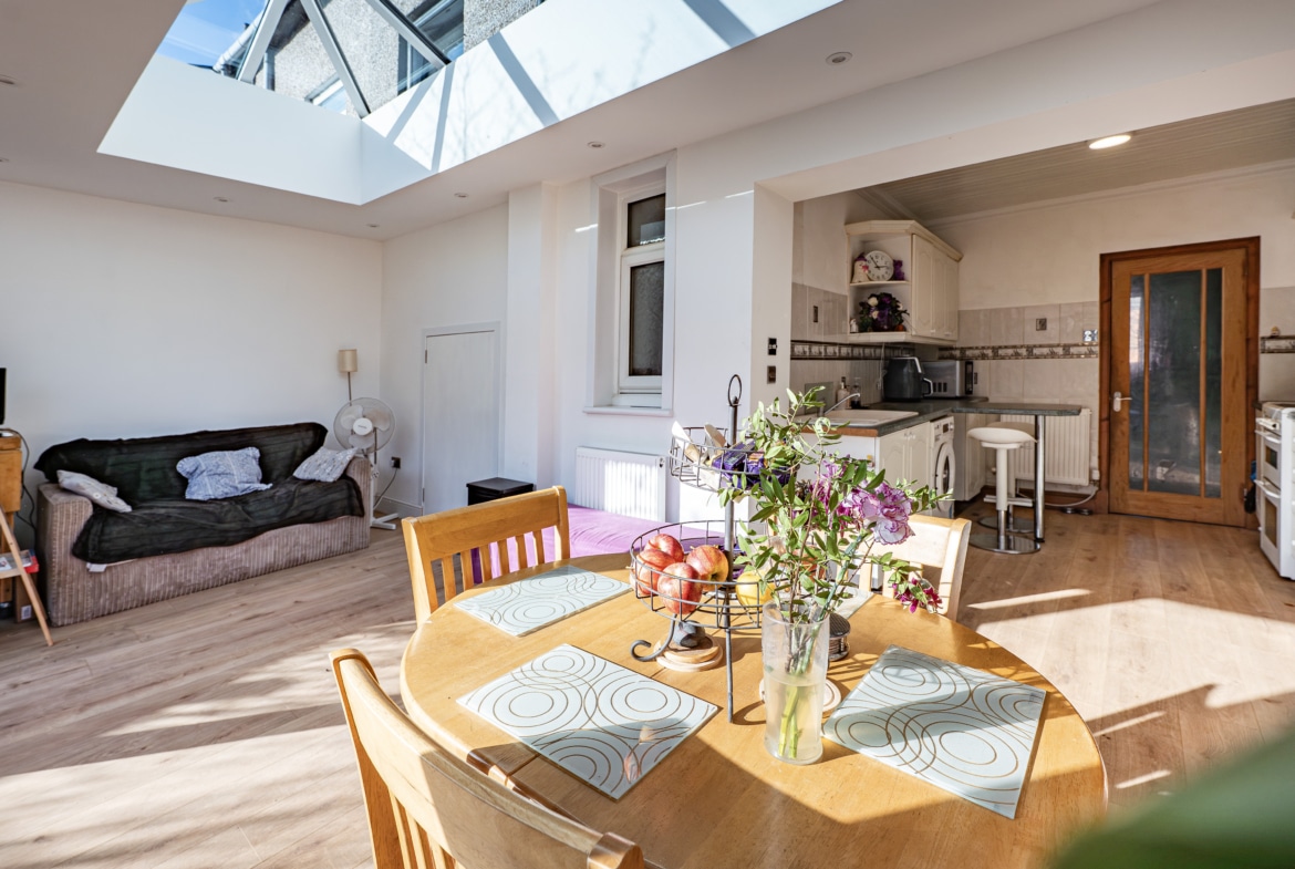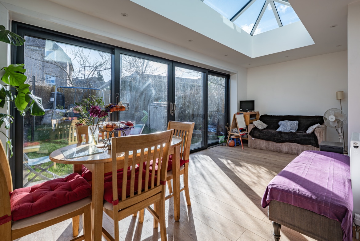 The accommodation begins with a welcoming entrance hallway, complete with fitted storage and a staircase leading to the upper level. To the front, a bright and comfortable lounge features an attractive focal point fireplace. To the rear, the well-appointed kitchen is arranged on an open-plan basis with a superb dining/sitting room extension, creating a generous and sociable living space. This impressive addition is enhanced by sliding warm core triple glazed doors opening directly onto the garden and a striking glass roof lantern, which floods the room with natural light. A well-appointed three-piece bathroom completes the ground floor.