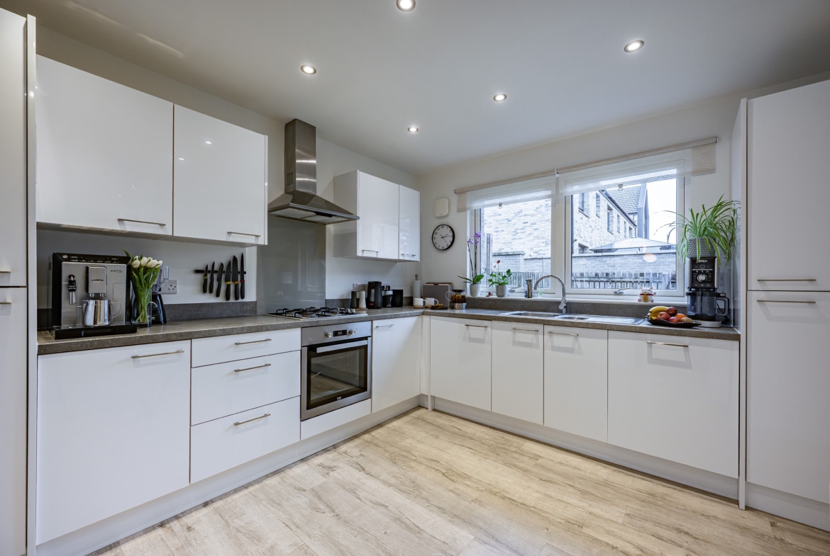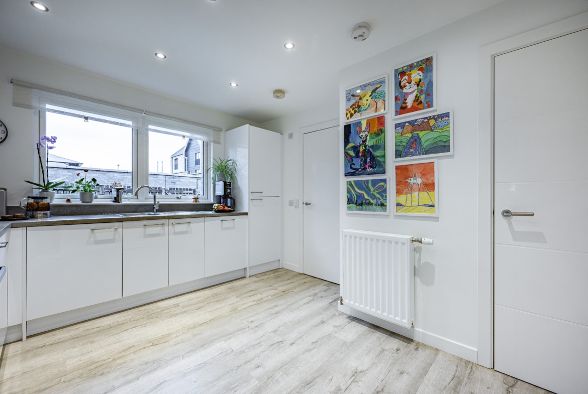 Notable features include high-quality floor coverings and tasteful neutral décor throughout. The property boasts a modern, well-proportioned kitchen equipped with a range of integrated appliances, while the ground floor guest WC and the main bathroom both feature contemporary sanitary ware and stylish fittings. Smart lighting is installed within the lounge, WC, and bathroom, while comfort and efficiency are ensured through double glazing and an efficient gas-fired central heating system powered by a Potterton combination boiler. The property also benefits from solar panel technology, enhancing its energy efficiency.
