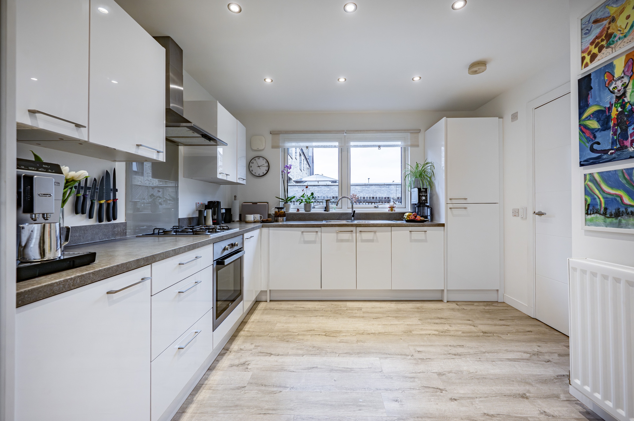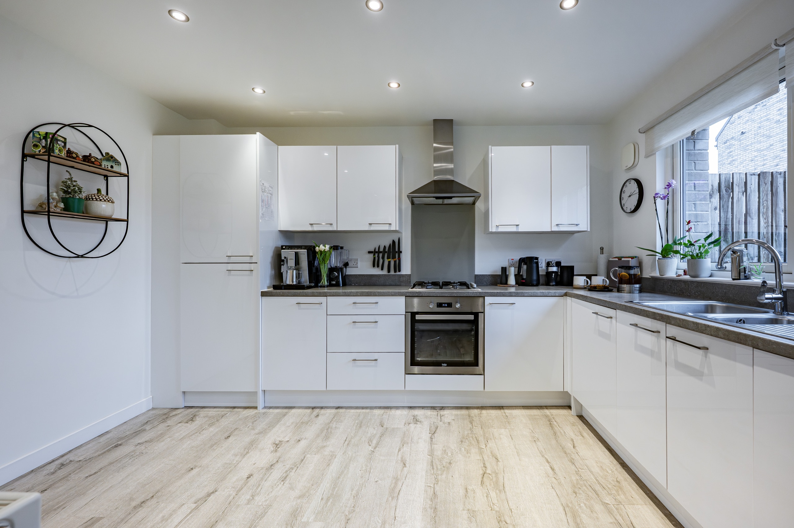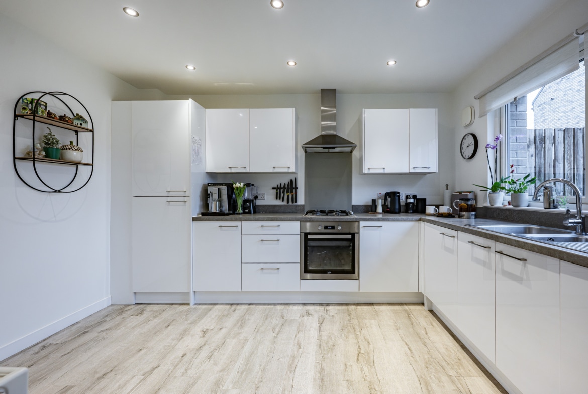 Internally, the accommodation begins with a welcoming entrance hallway with a staircase leading to the upper level. From here, access is gained to the impressive lounge/dining room, which benefits from a full-height window to the front and a useful under-stair storage cupboard. The space flows seamlessly into the attractive breakfasting-sized kitchen at the rear. The kitchen is thoughtfully designed with a range of base and wall-mounted units, contrasting work surfaces, and a selection of integrated appliances including a fridge freezer, dishwasher, washing machine, oven, and gas hob. A useful pantry cupboard and a rear hallway providing access to the garden and a stunning guest WC complete the ground floor accommodation.