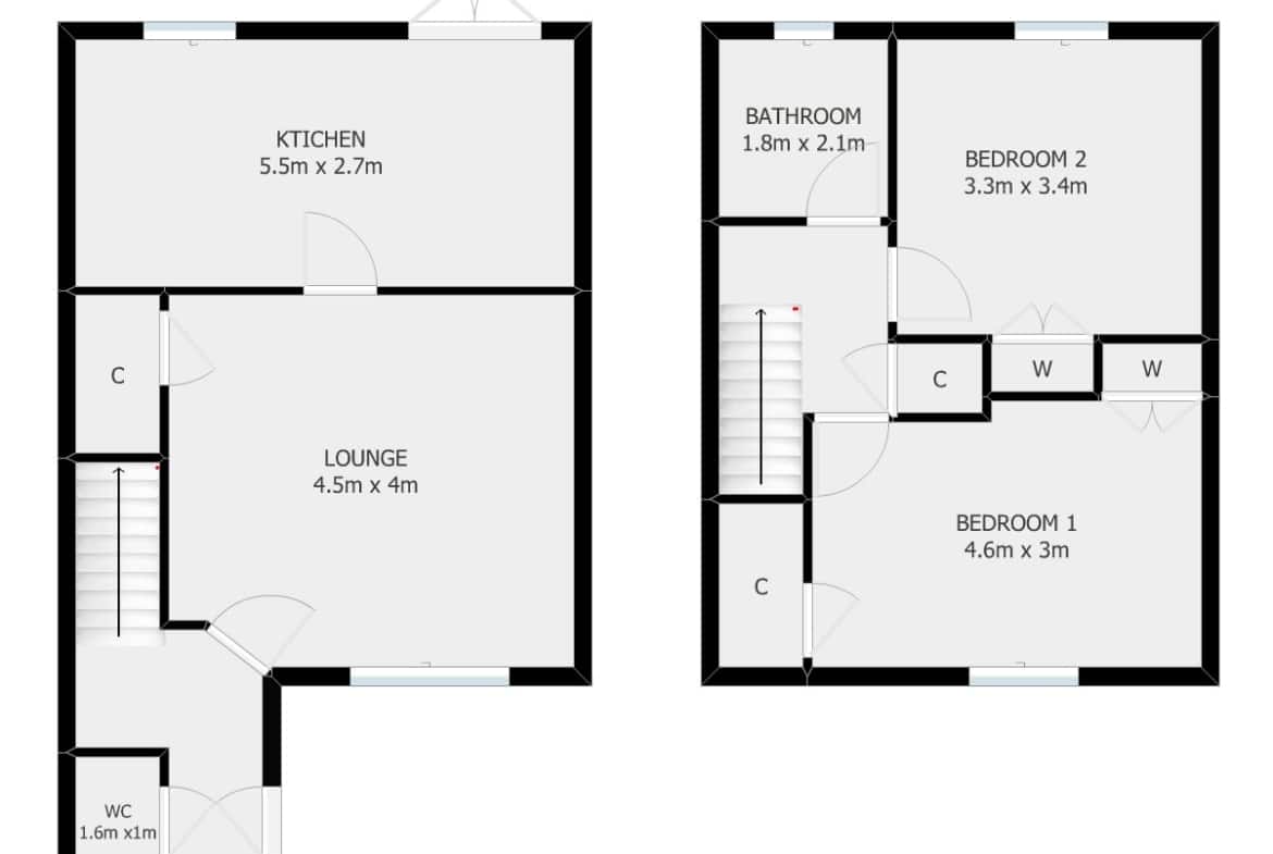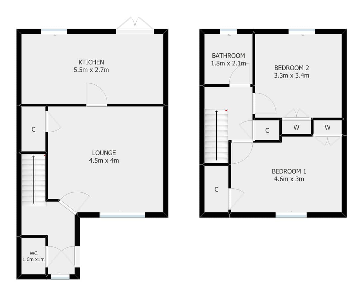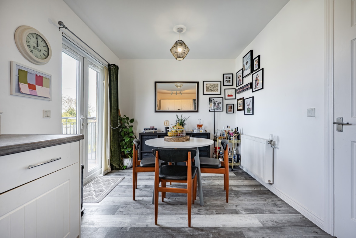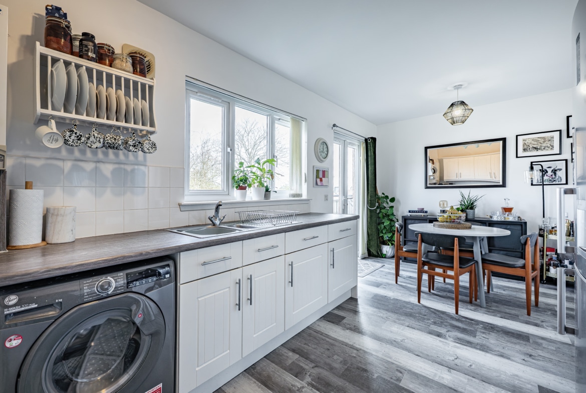 The accommodation begins with a welcoming reception hallway, complete with a staircase to the upper level and access to a convenient ground floor WC. The bright and spacious formal lounge provides an inviting living space and benefits from useful under-stair storage. To the rear, a generous dining-sized kitchen spans the width of the property and features French doors opening directly onto the garden, creating an ideal space for both everyday living and entertaining. The kitchen is fitted with a range of base and wall-mounted units and offers ample space for freestanding appliances.