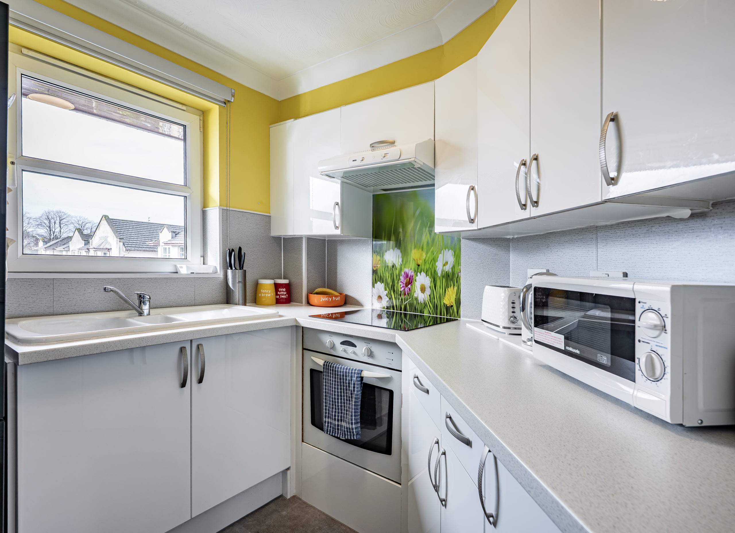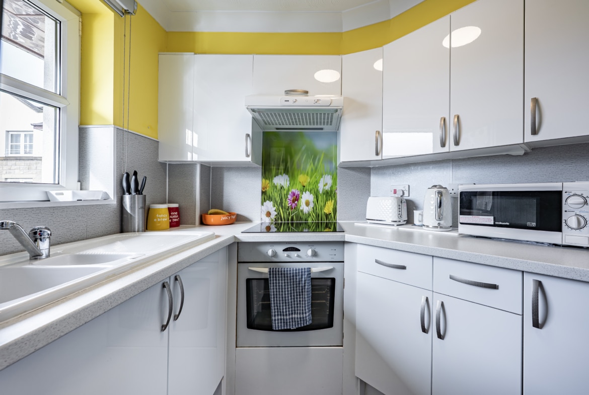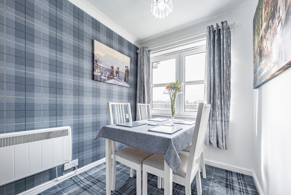 Internally, the property comprises a spacious entrance hallway with a deep walk-in storage cupboard. The immediately impressive dual-aspect lounge/dining room is flooded with natural light and enjoys pleasant open views from both windows. The well-equipped kitchen offers a range of base and wall-mounted units, contrasting work surfaces, an inset sink, and an integrated oven and hob.
