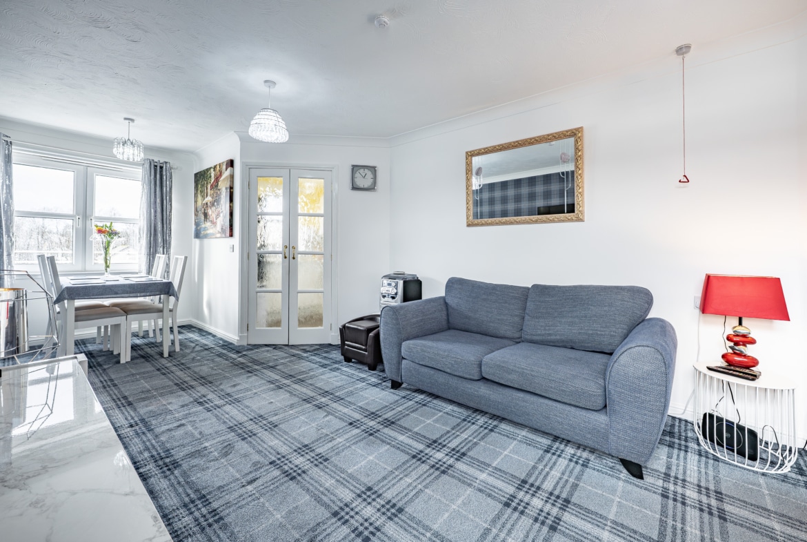 A rare opportunity to acquire this truly unique retirement flat, occupying a prime position on the gable end of this highly regarded McCarthy & Stone development in central Rutherglen. Its enviable position results in a bright dual-aspect lounge with terrific open views, while the principal bedroom benefits from a separate dressing area – a particularly sought-after feature within this style of property.