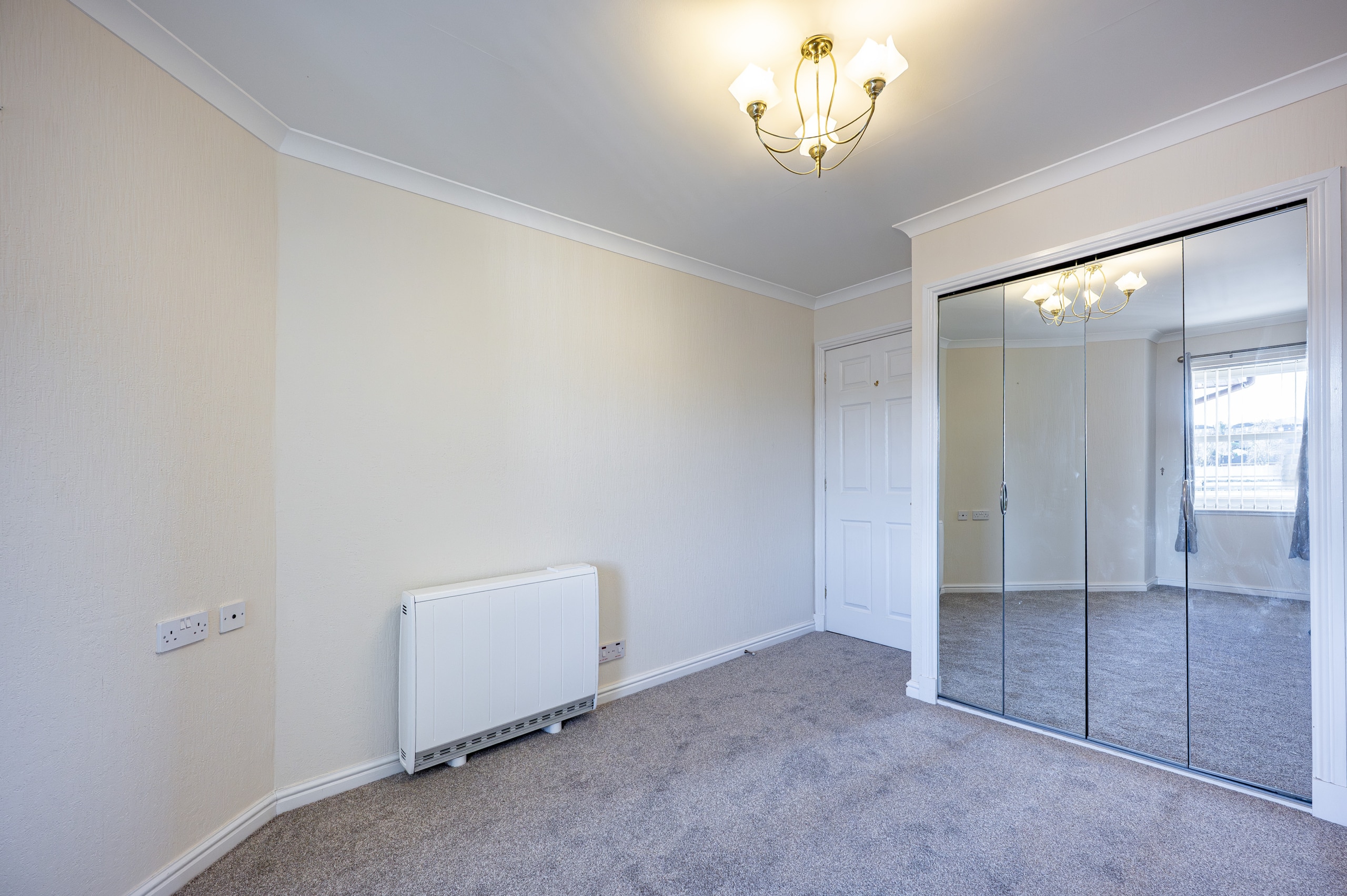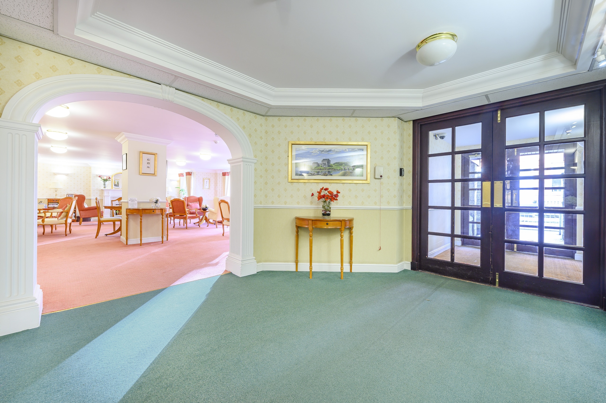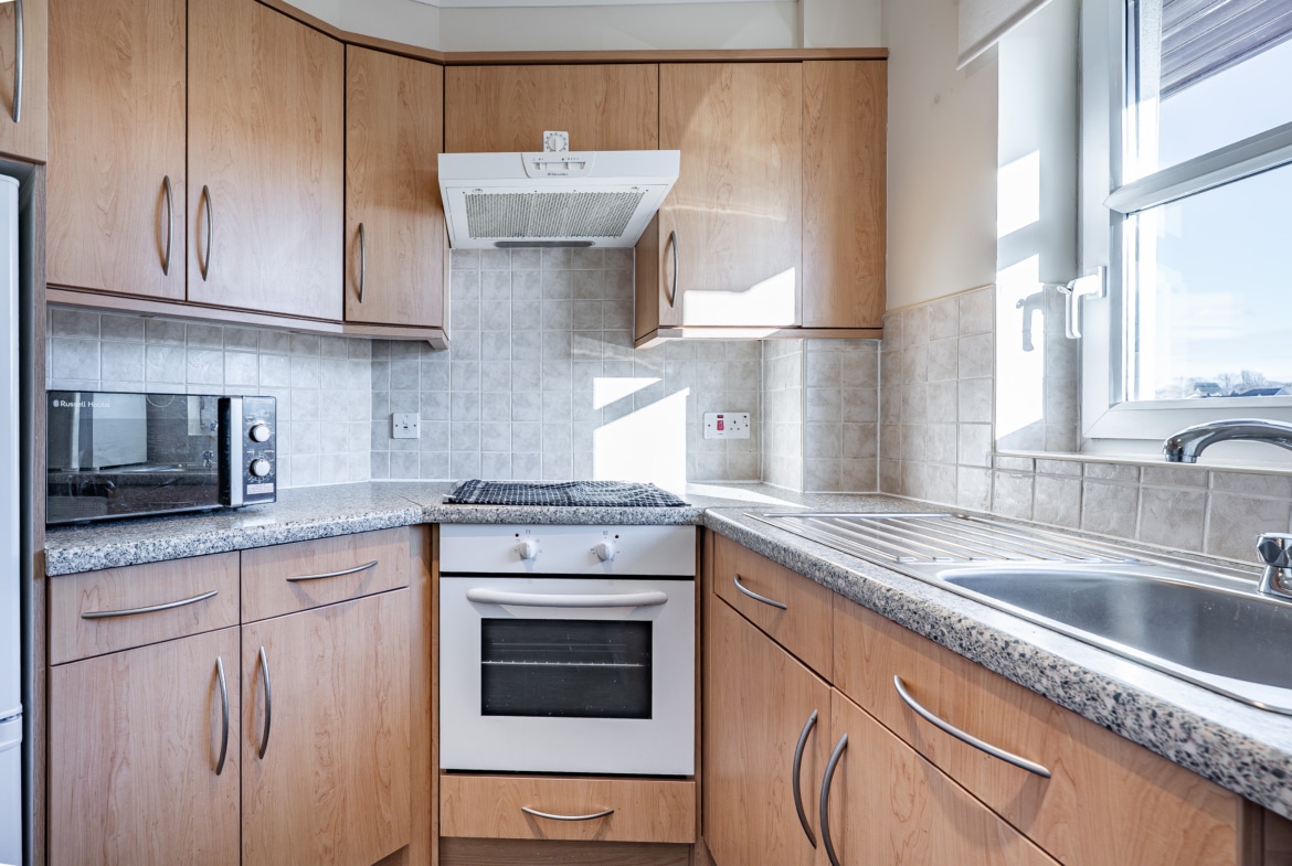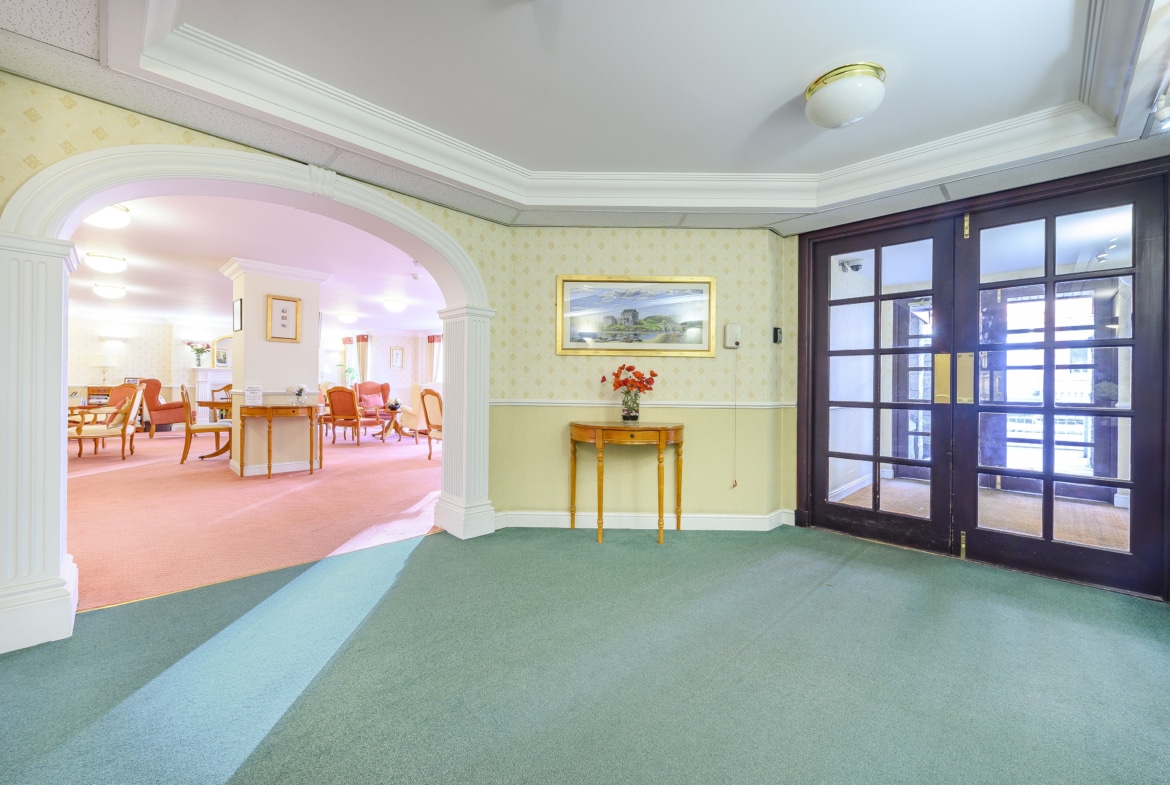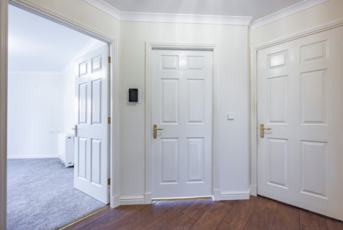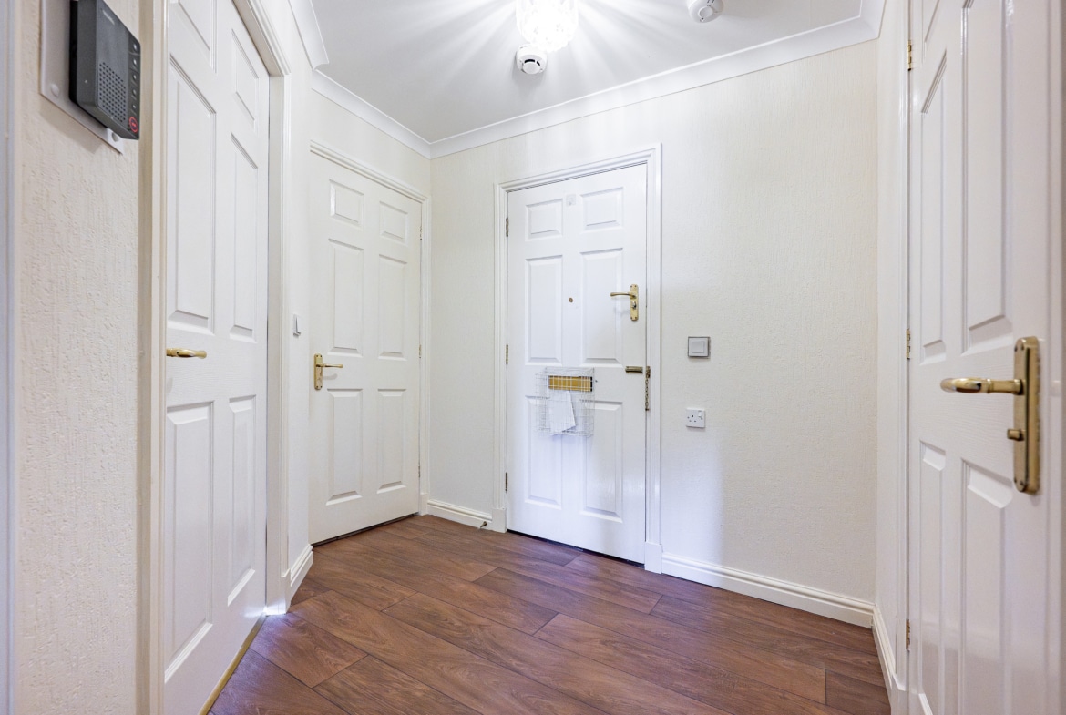 Access to the building is via a secure entry system leading into a welcoming communal hallway, complete with residents’ lounge and both lift and stair access to all levels. A solid timber door opens into the flat’s inviting reception hallway, which includes a spacious walk-in storage cupboard.
