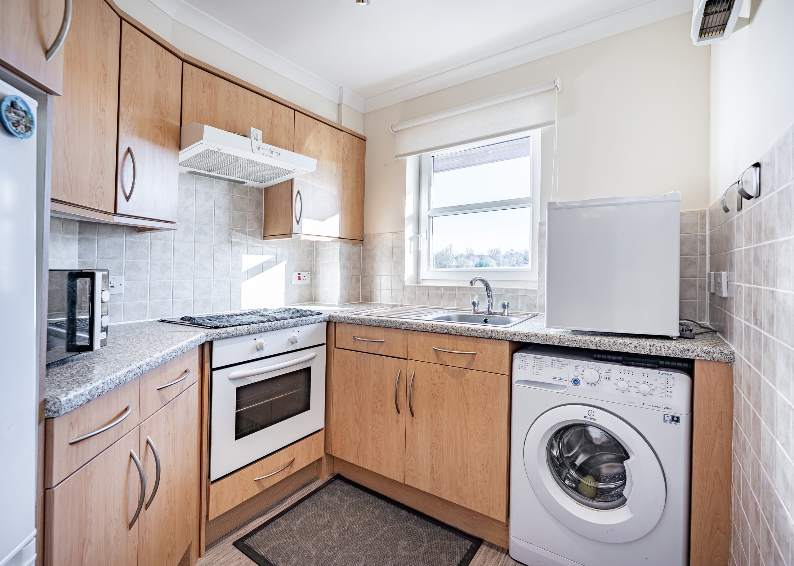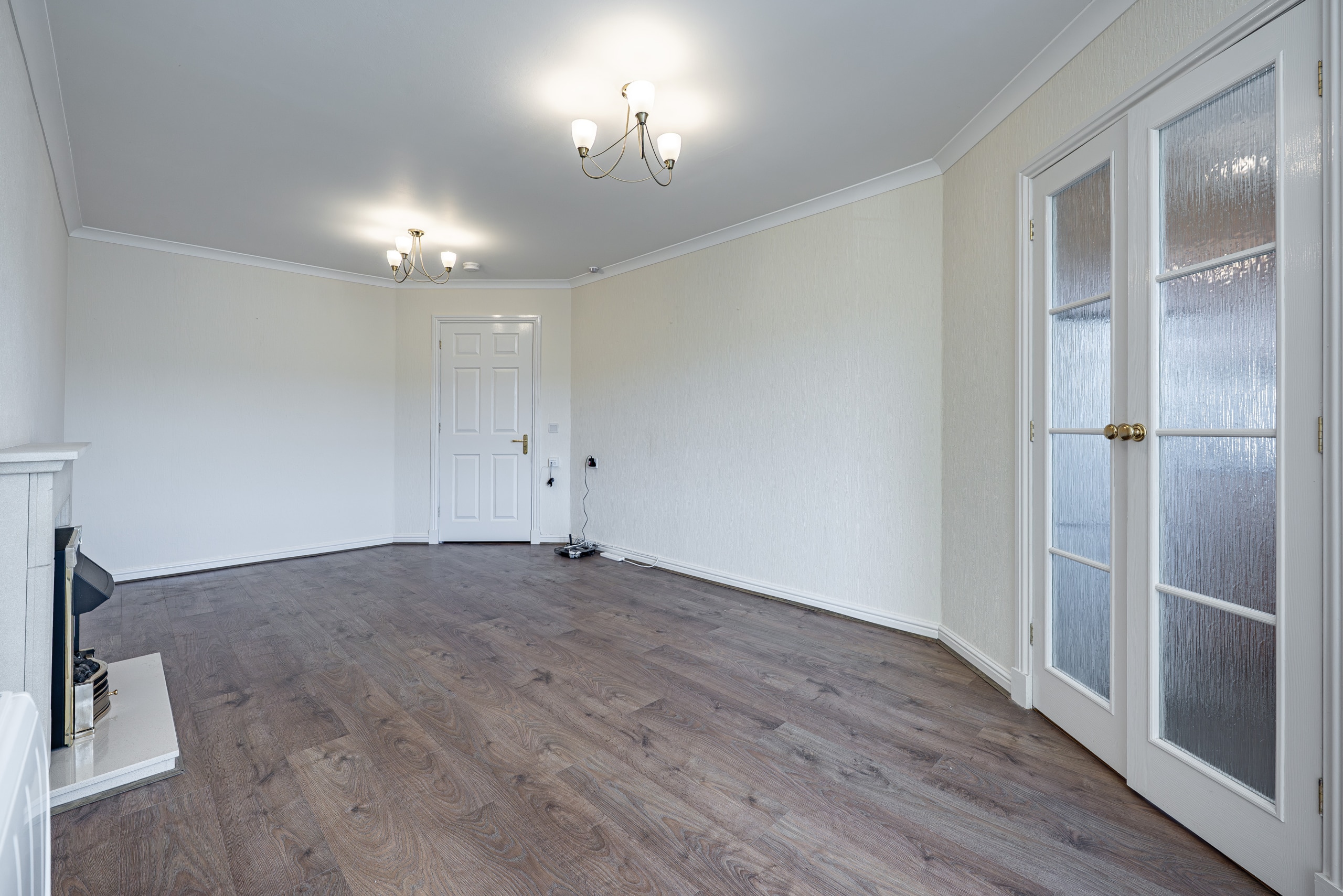 The centrepiece of the home is the impressive lounge/dining room, extending to approximately seven metres in length. This well-proportioned apartment features a focal point fireplace and provides access to a well-equipped kitchen fitted with a range of base and wall-mounted units, an integral oven, ceramic hob, freestanding fridge freezer, and space/plumbing for a washing machine or dishwasher.