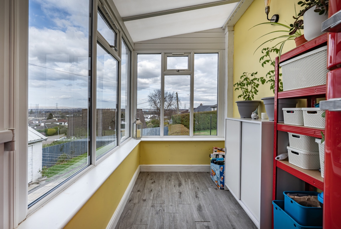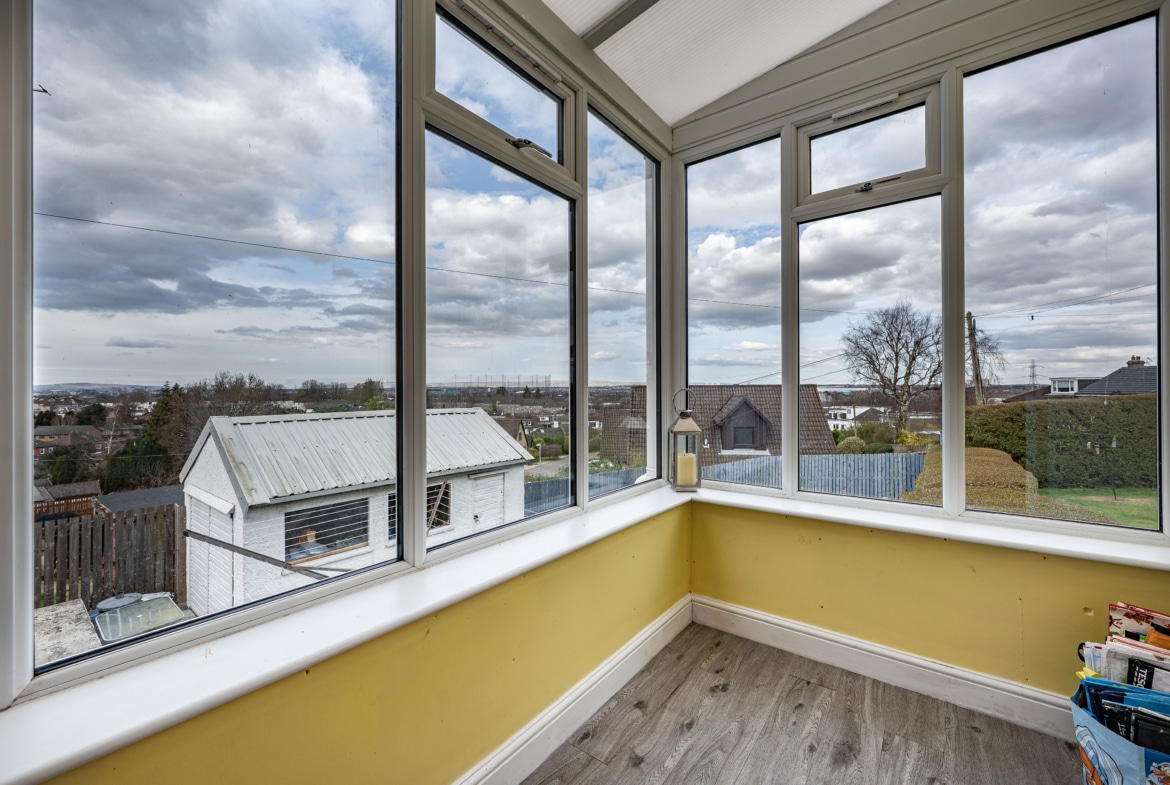 The accommodation is thoughtfully arranged, with a front porch leading into a welcoming reception hallway. An overhead hatch provides access to a valuable floored attic, offering excellent additional storage. To the front, the generous lounge is bathed in natural light via a broad bay window. From here, access is provided to a well-appointed kitchen, complete with a range of base and wall-mounted units, integrated oven and gas hob, and ample space for freestanding appliances. The kitchen flows seamlessly into a delightful sunroom, offering a peaceful setting from which to enjoy the far-reaching views in all seasons.