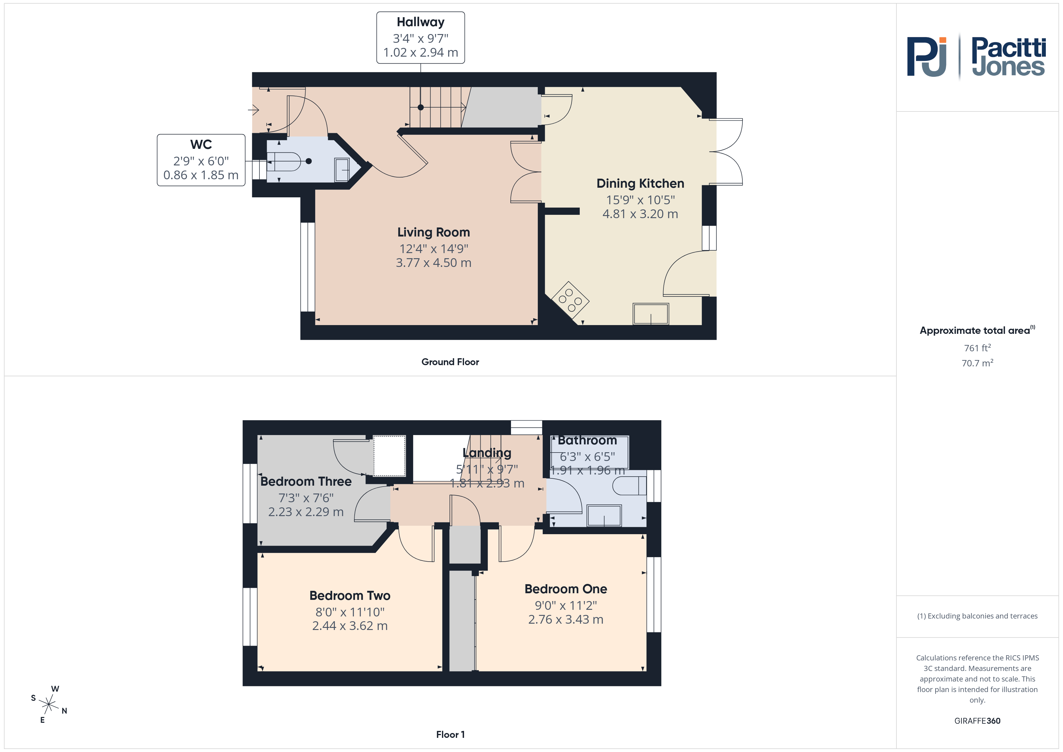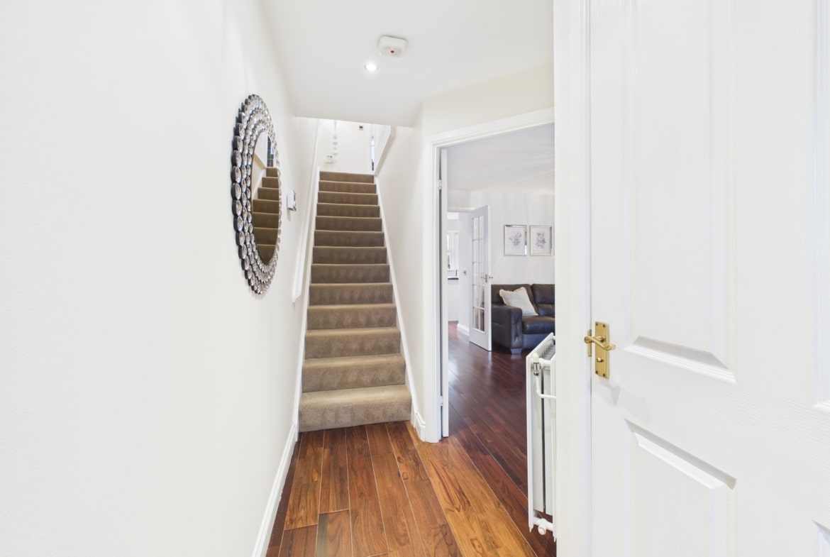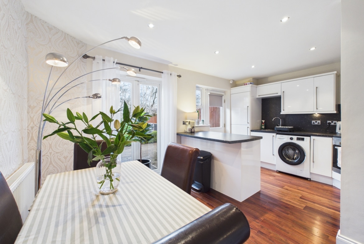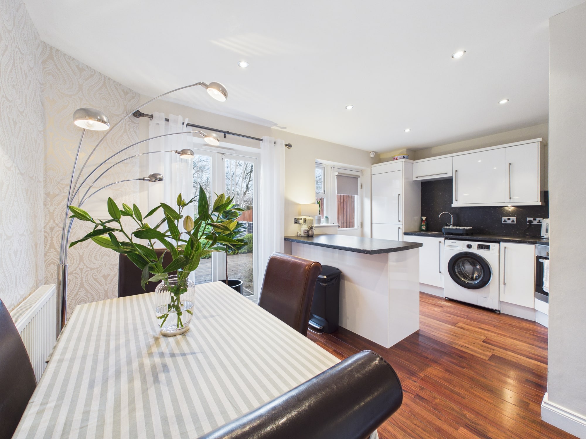 Accommodation is arranged over two levels comprising. Entrance to property via front facing solid wooden door with glass insert giving access to entrance hallway. Hallway with solid wooden flooring leads to lounge, cloakroom wc and carpeted staircase. Spacious lounge with front facing window formation and solid wooden flooring. Lounge leads to dining kitchen via French doors. Fully fitted dining kitchen with solid wooden flooring comprising range of base and wall mounted units, ample work surfaces, integral fridge freezer, electric oven, hob and extractor. The kitchen area gives access to rear garden via half glazed solid wooden door. Dining area benefits from rear facing French doors overlooking and giving access to rear garden. Front facing cloakroom wc comprising low flush wc, wash hand basin, partially tiled walls, heated towel rail and tiled flooring.