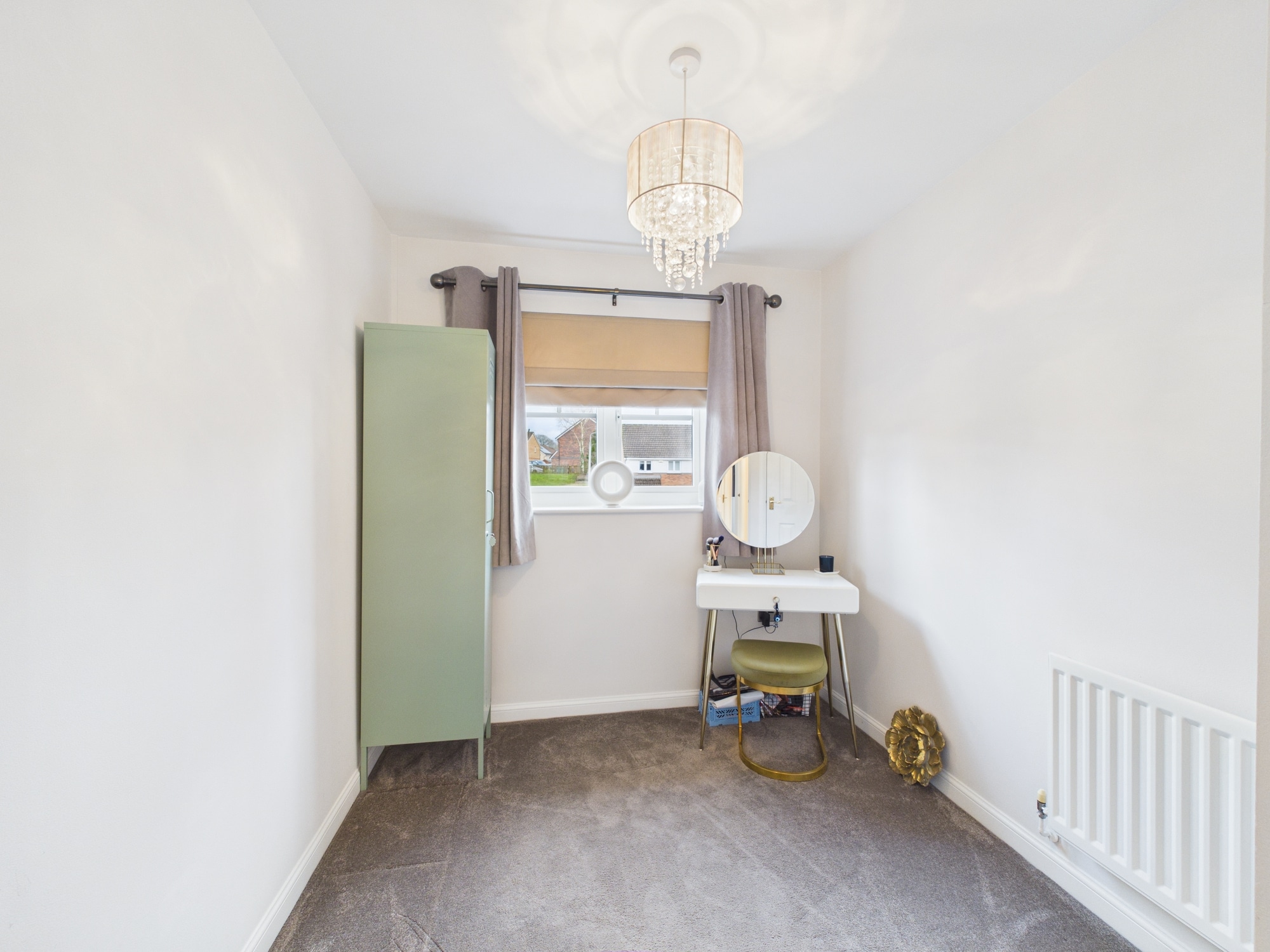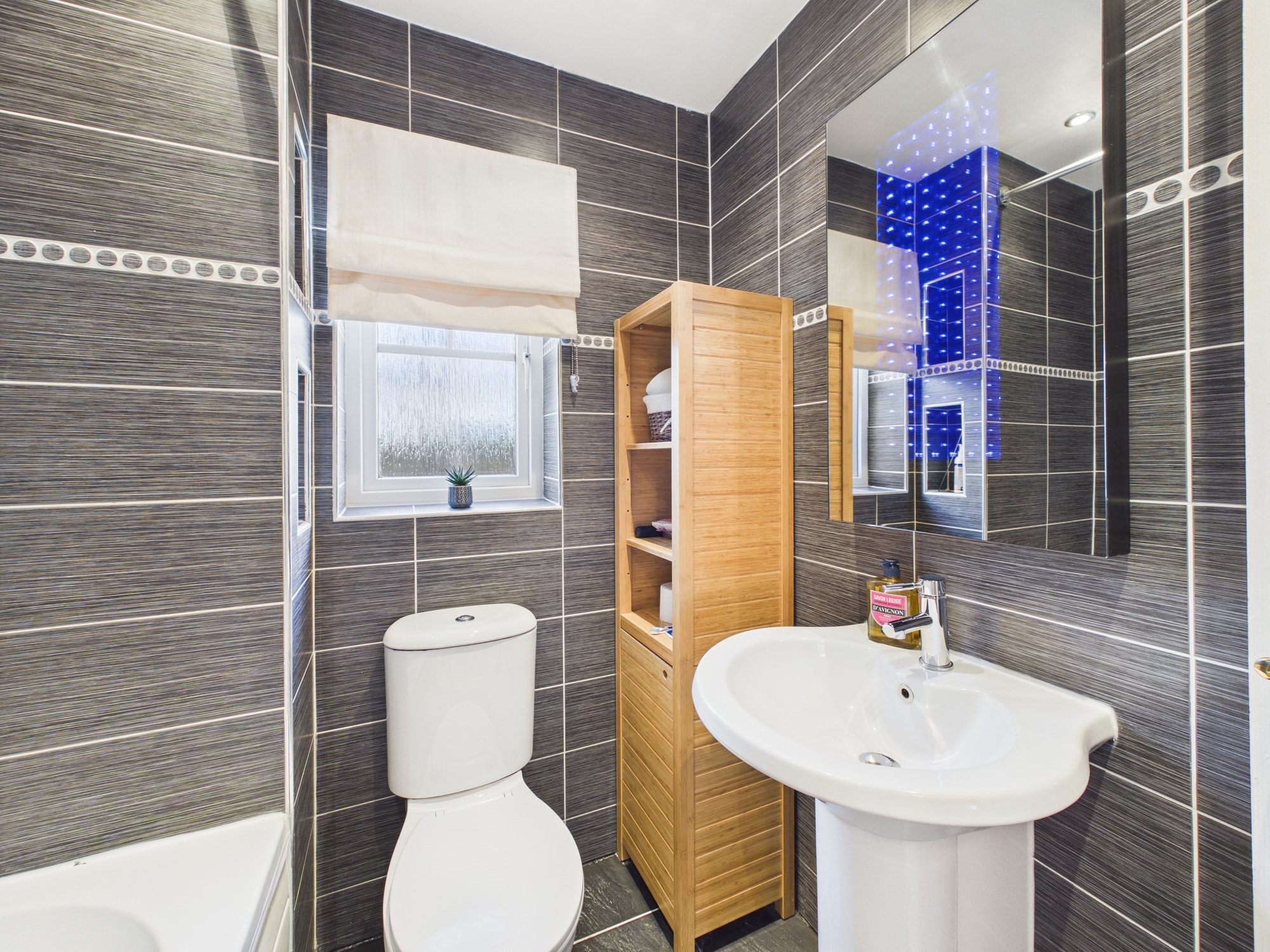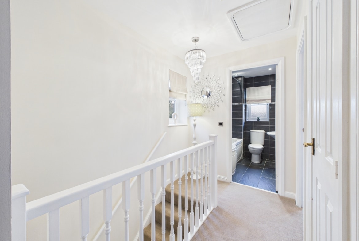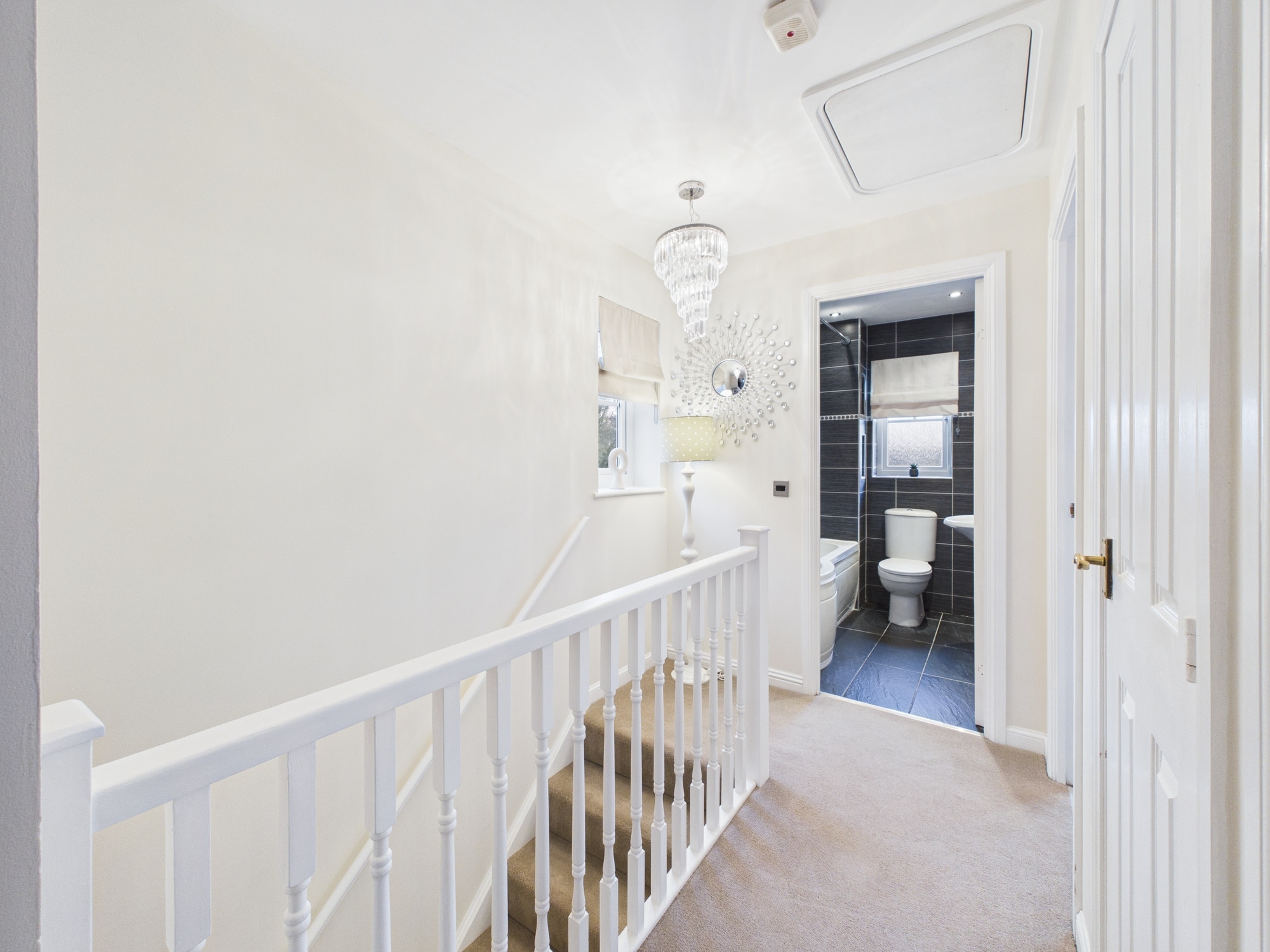 Side facing upper landing with fitted carpet and decorative timber balustrade gives access to three bedrooms, family bathroom, storage and loft hatch. Bedroom one is rear facing with fitted carpet and wardrobes. Bedroom two is front facing with fitted carpet. Bedroom three is again front facing with fitted carpet. Rear facing family bathroom comprising low flush wc, wash hand basin, bath, shower (over bath), decorative alcove, heated towel rail, fully tiled walls and tiled flooring.