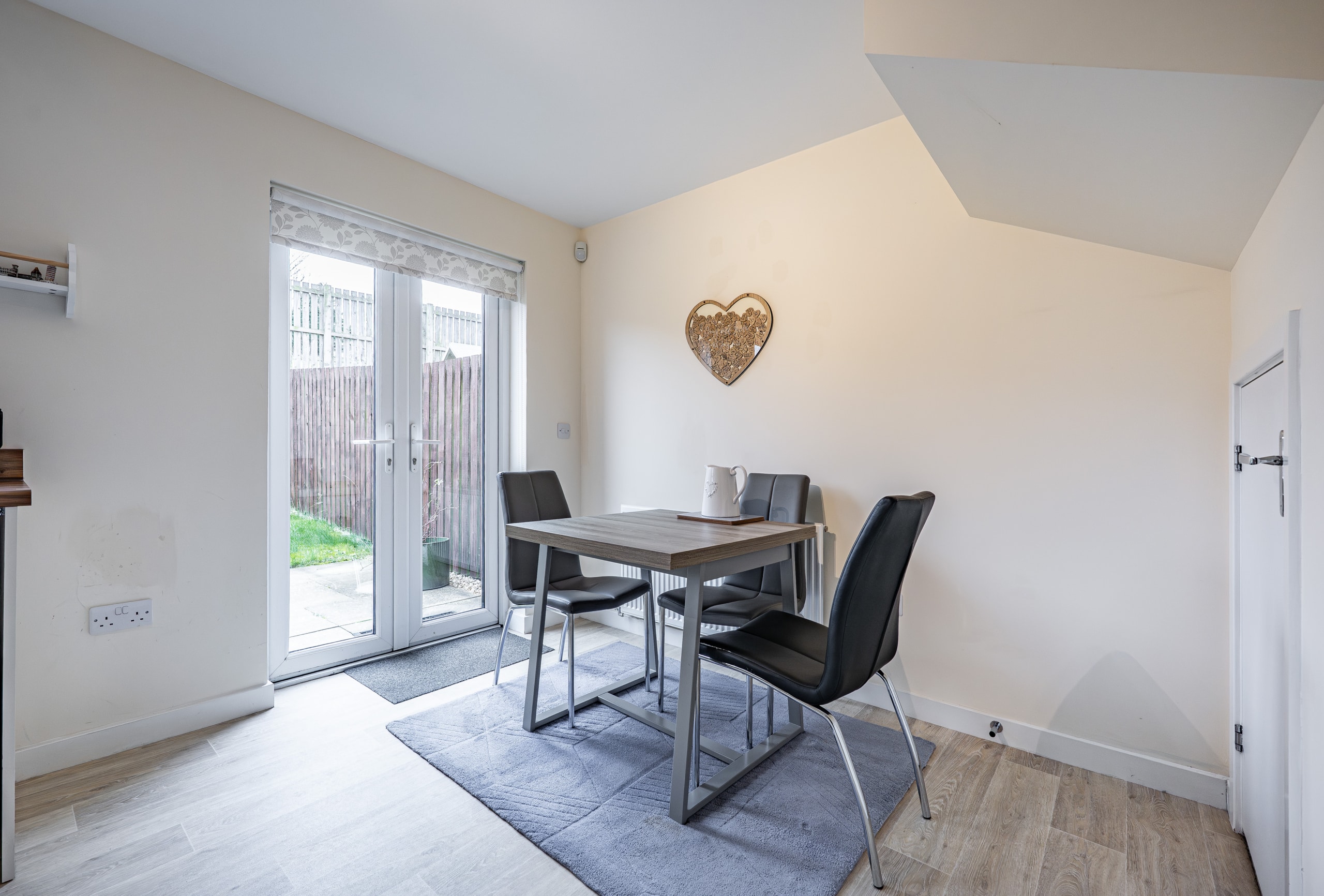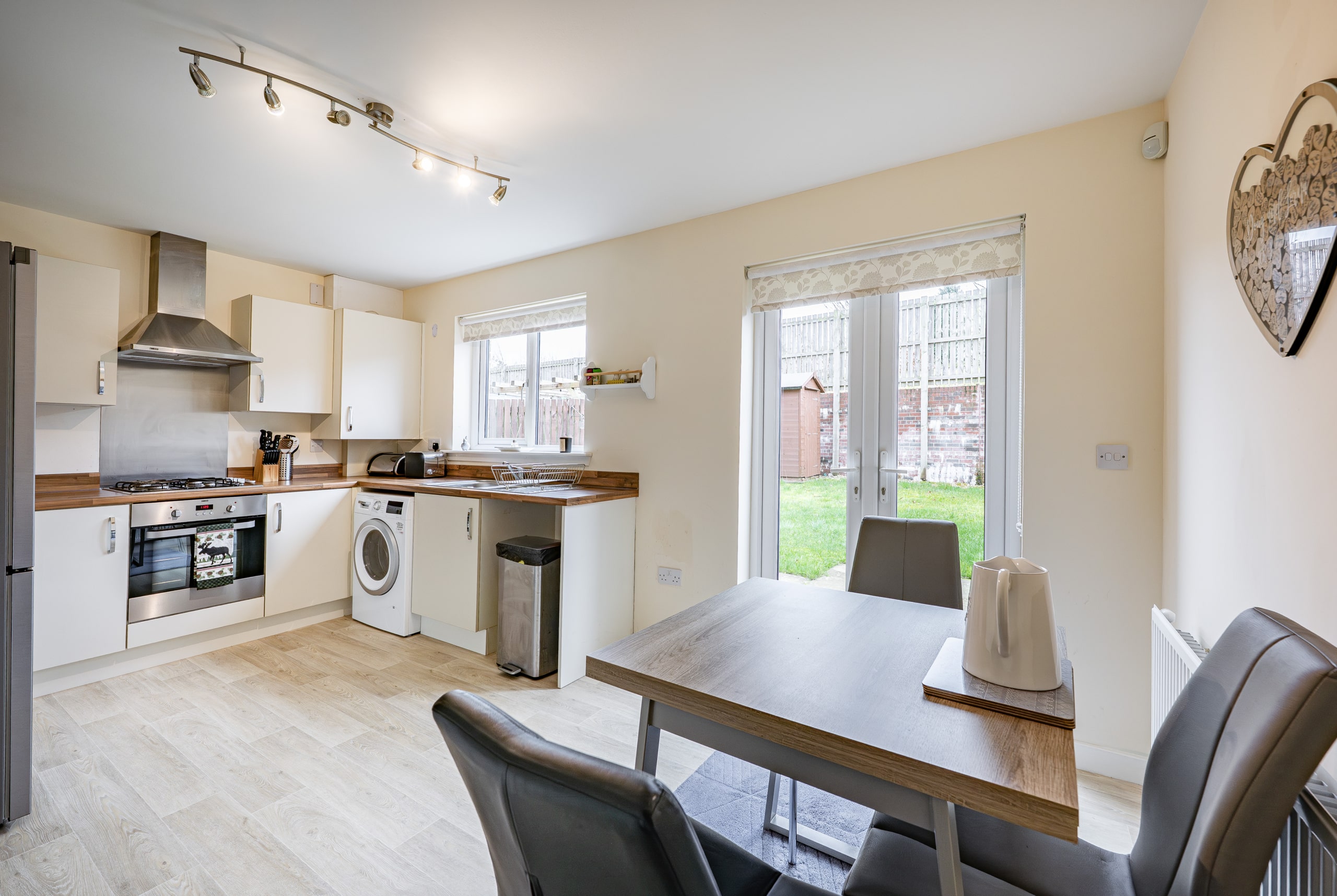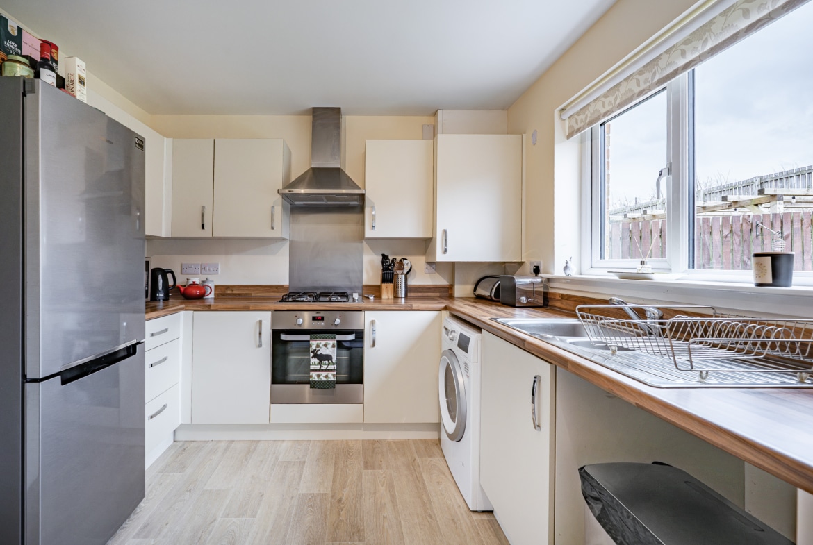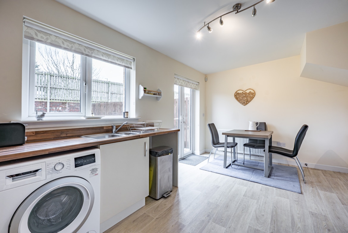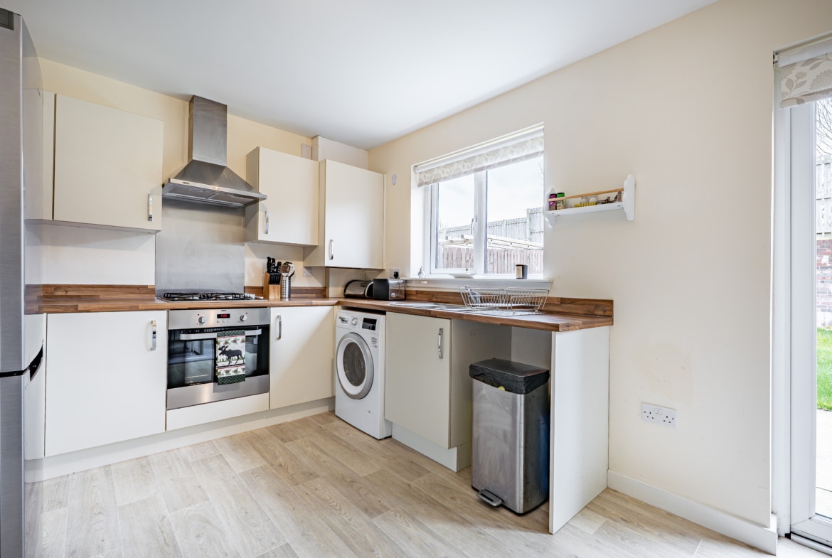 The accommodation begins with a welcoming entrance hallway, complete with a convenient cloakroom/WC. To the front, there is an elegant and bright lounge, while the rear of the property hosts a generous kitchen/diner fitted with an integrated oven and gas hob, alongside ample space for freestanding appliances and dining furniture. French doors provide direct access to the rear garden, and there is also a useful under-stair storage cupboard.