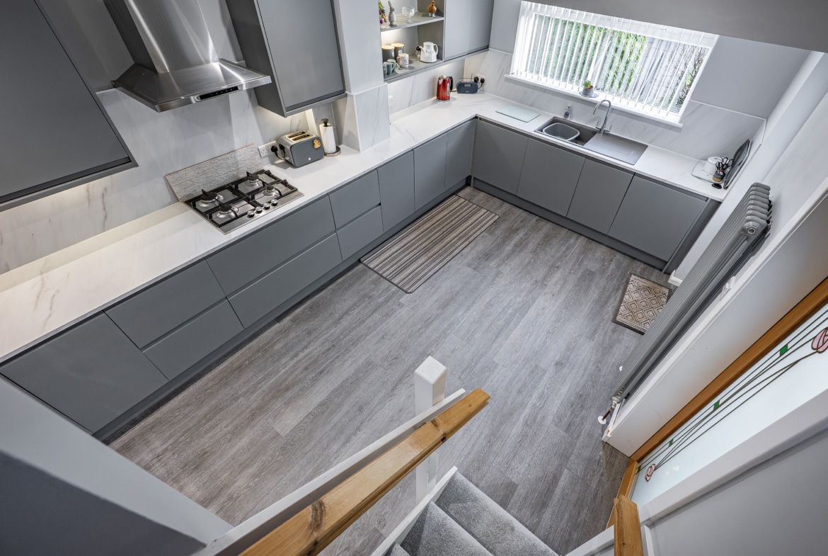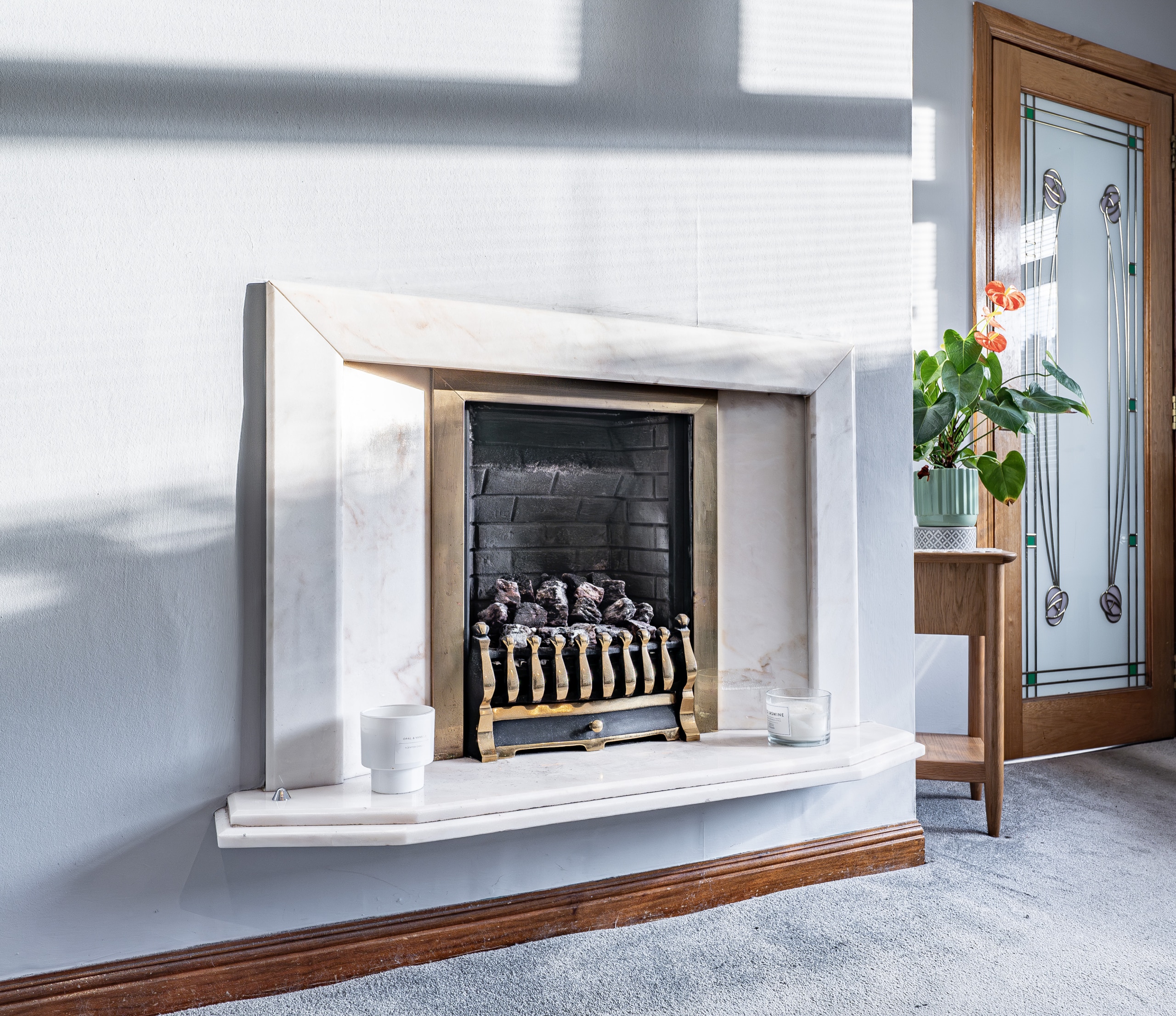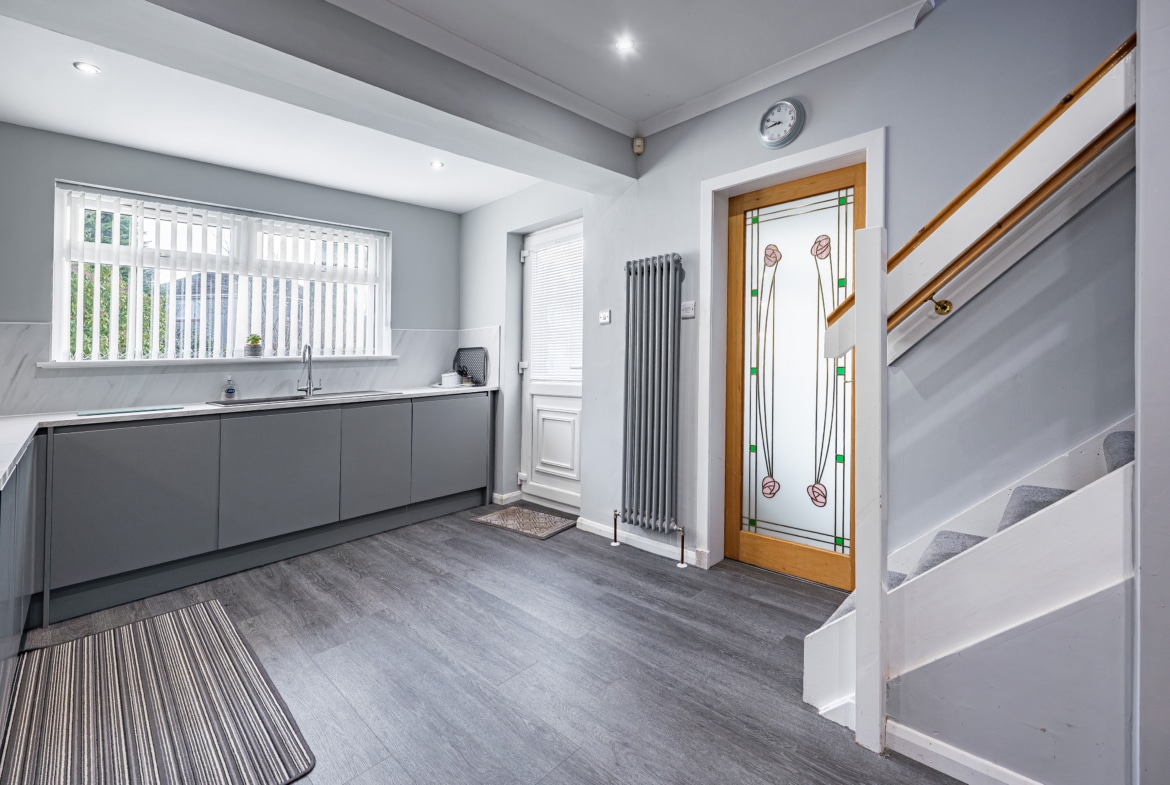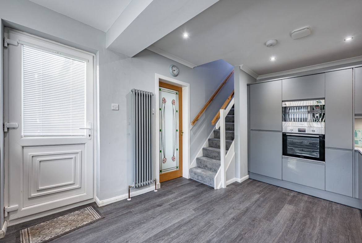 The main entrance is at the side of the house and opens into an entrance vestibule. This leads through to a hallway with storage. The lounge is at the back of the house and is a good sized room with a fireplace and fresh modern decor.