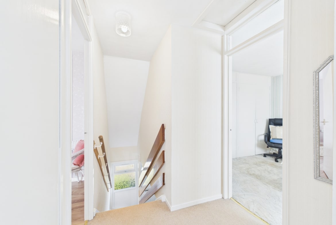 Carpeted upper landing gives access to two further double bedrooms, shower room and loft hatch. Bedroom two is rear facing with fitted carpet and provides abundance of storage with generous fitted wardrobes and storage cupboard. Bedroom three is again rear facing with fitted wardrobes and laminated flooring. Rear facing shower room comprising low flush wc, wash hand basin, double shower cubicle, fully tiled walls and vinyl flooring.