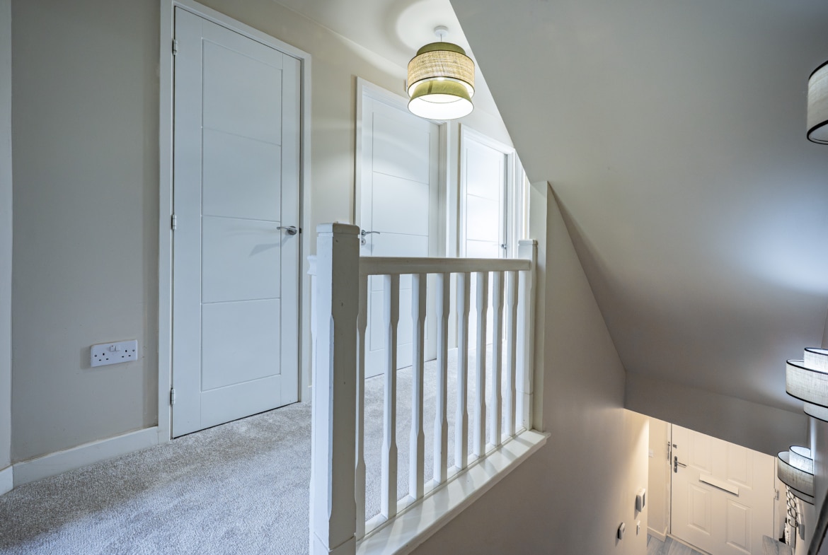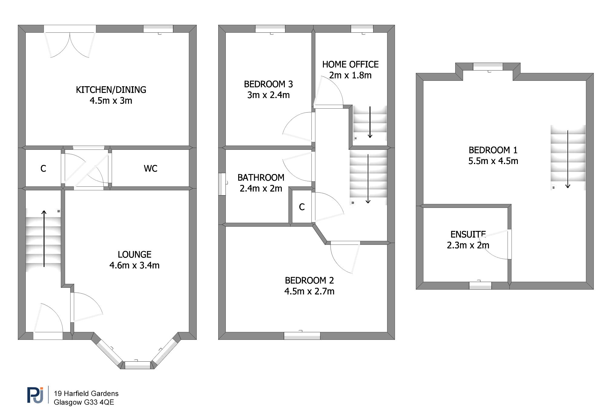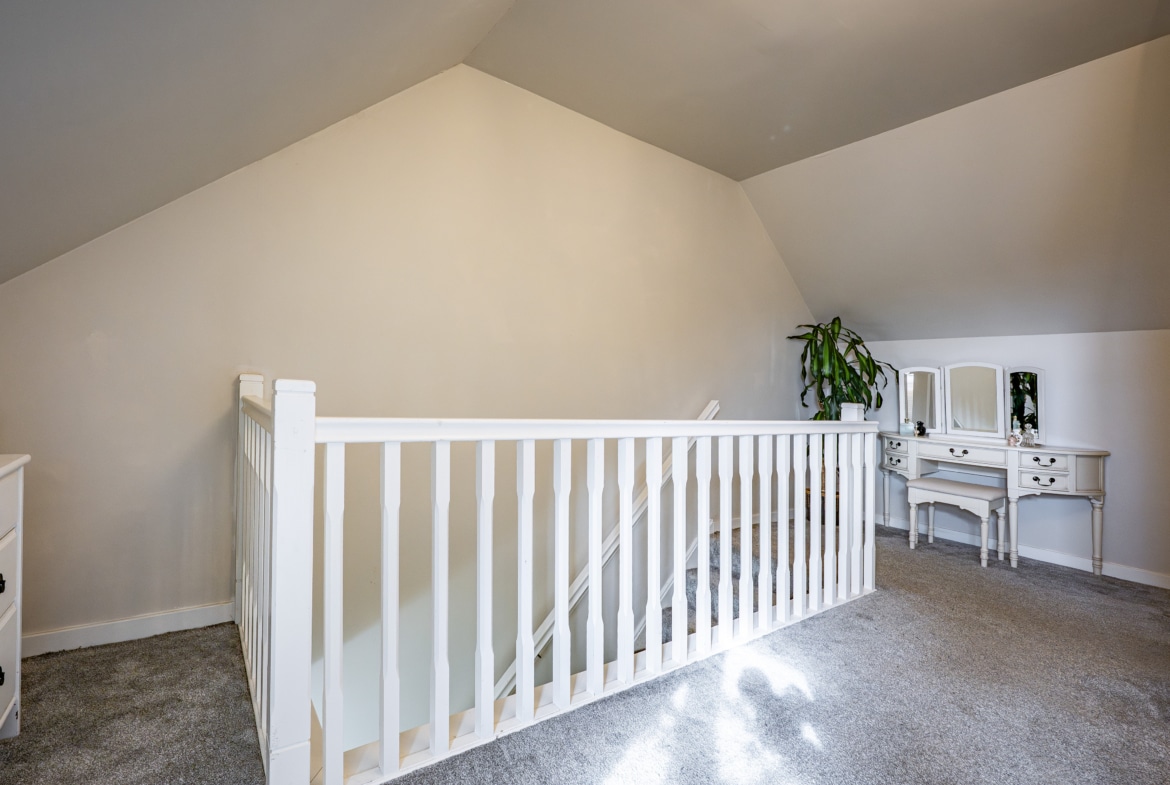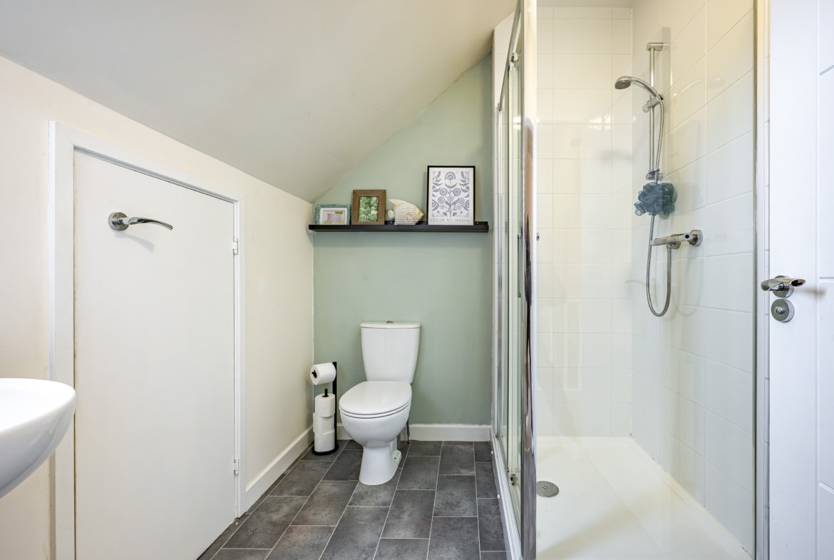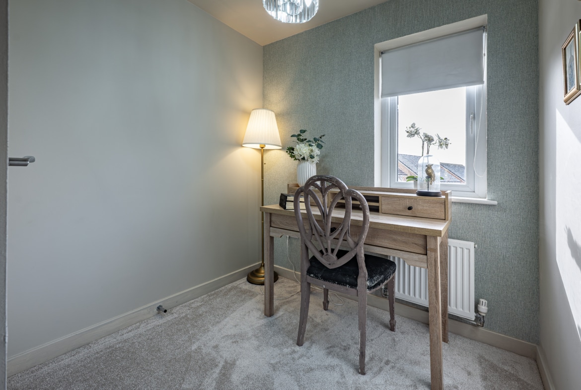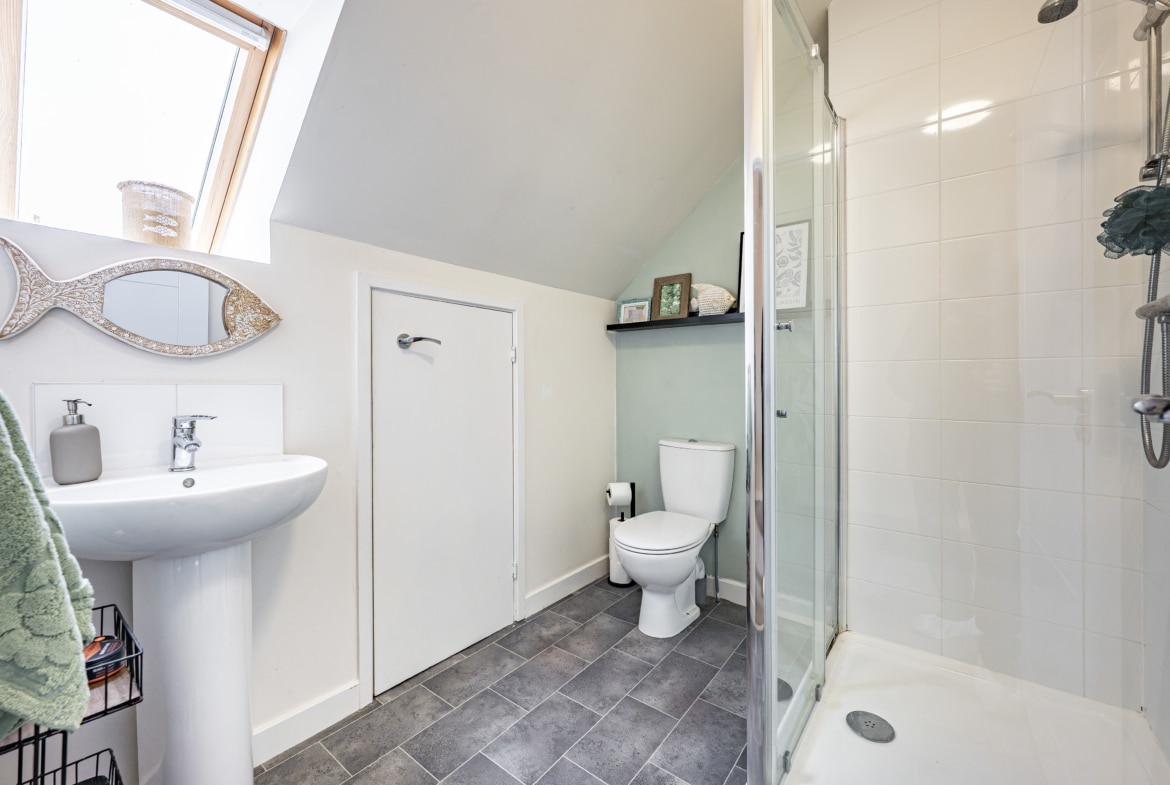 The accommodation begins with a warm and welcoming entrance hallway, where a staircase rises to the upper levels. The lounge is a comfortable front-facing room, featuring a bay window. From here, there is an inner hallway with fitted storage, access to the guest w.c. and the impressive dining-sized kitchen, which opens through French doors to the rear garden. On the first floor, there are two large double bedrooms, a well-appointed three-piece bathroom, and a designated work-from-home or study area. The top floor reveals a spectacular principal bedroom with an en-suite shower room, and excellent floored eaves storage.