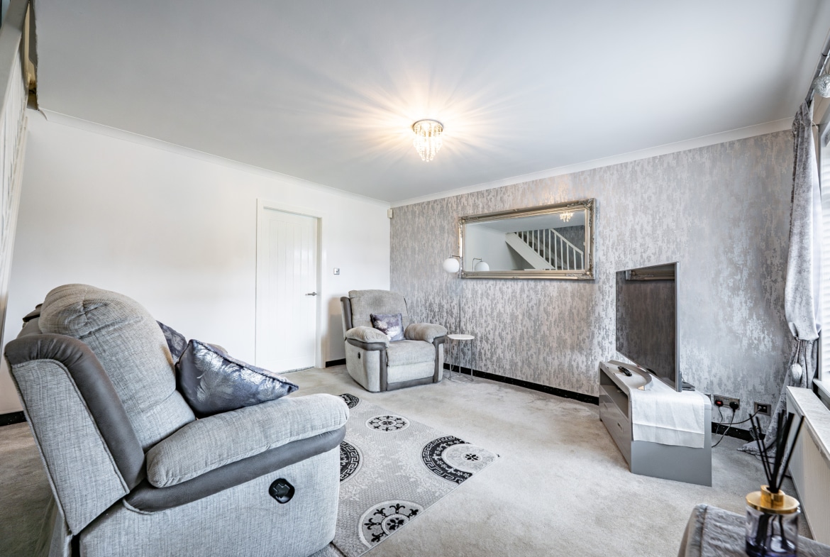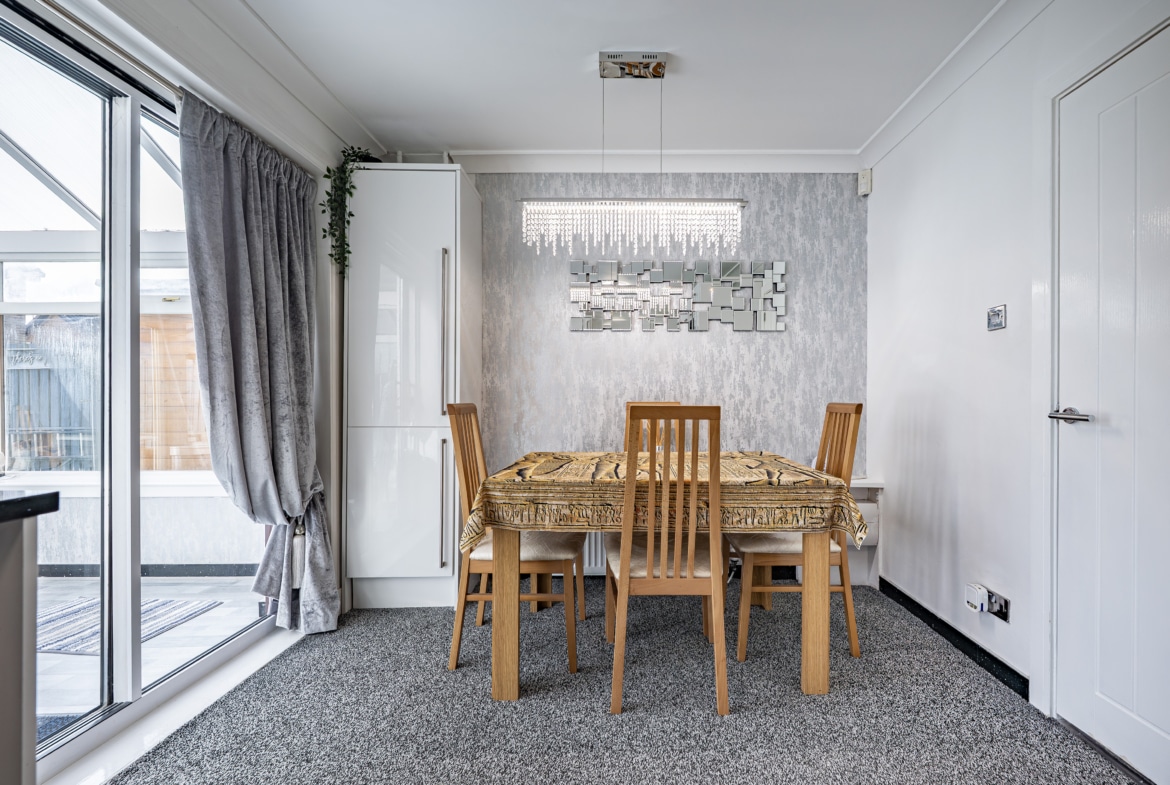 The accommodation begins with an entrance porch leading into a bright and comfortable front-facing lounge. To the rear, the contemporary dining kitchen is well-equipped with a range of modern units, including an integral oven and hob, an American-style fridge freezer, and space for a washing machine. The kitchen flows seamlessly into a spacious conservatory, providing an excellent additional living area with direct access to the garden – ideal for both everyday family life and entertaining.