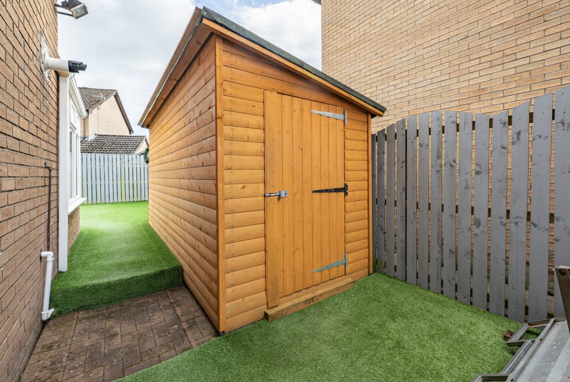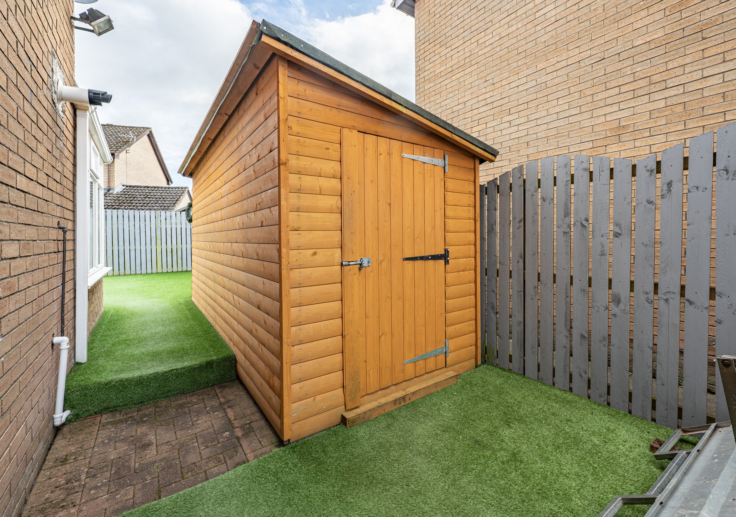 Externally, the fully enclosed rear garden enjoys a sunny, south-facing aspect and has been designed for ease of maintenance, featuring an artificial lawn ideal for family use. To the side, there is a substantial shed/workshop, adding valuable storage space. To the front, the garden incorporates a well-tended lawn bordered by hedging and established planting, alongside a block-paved driveway providing off-street parking for two to three vehicles.