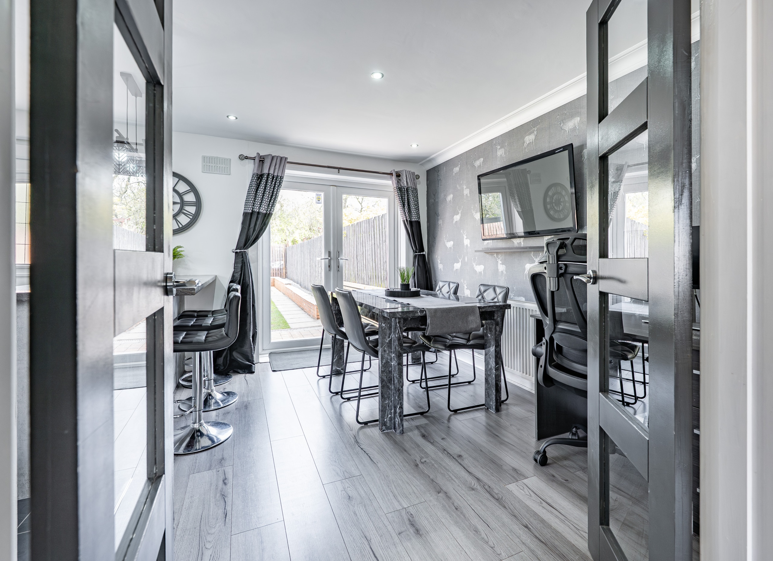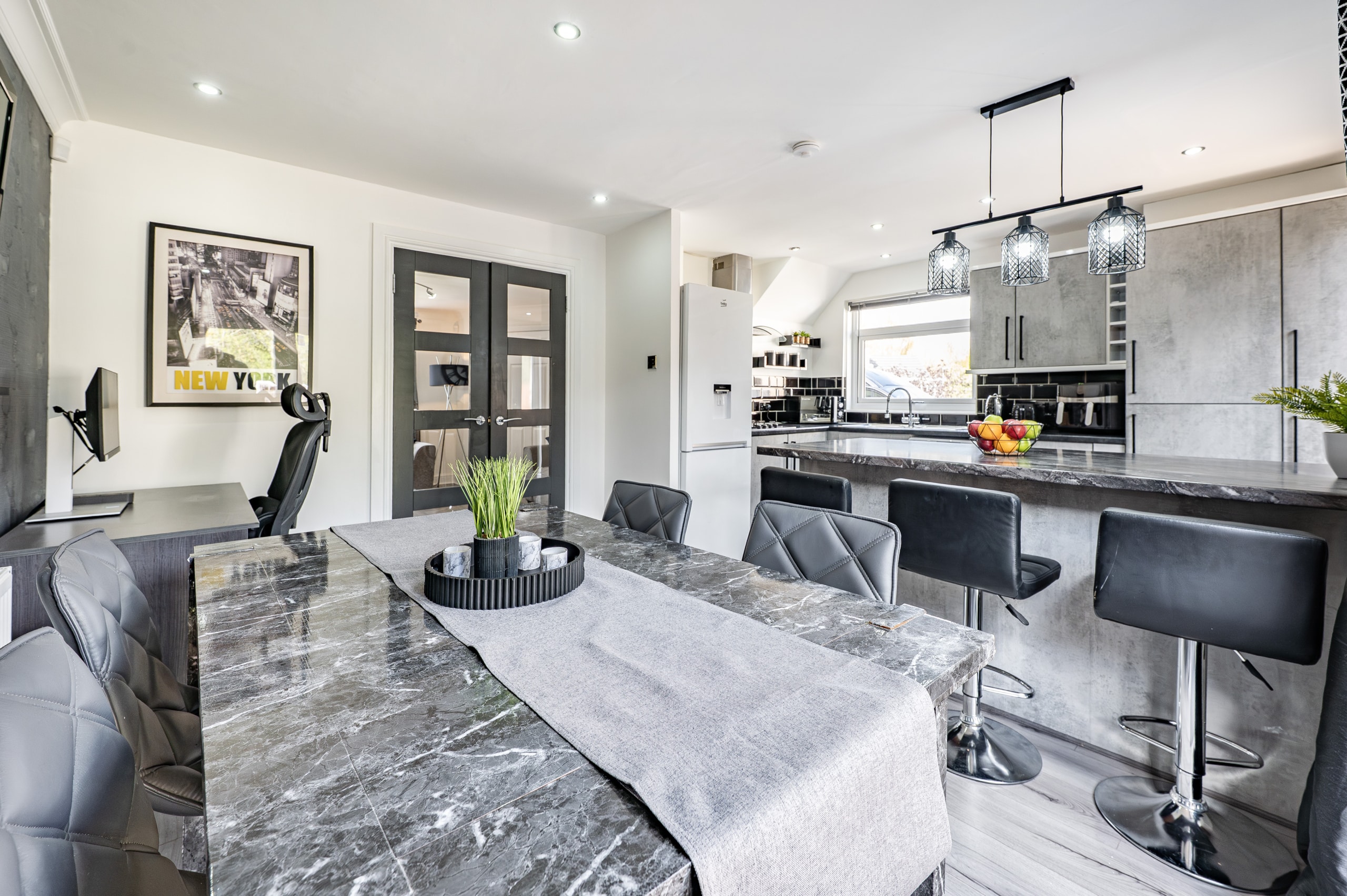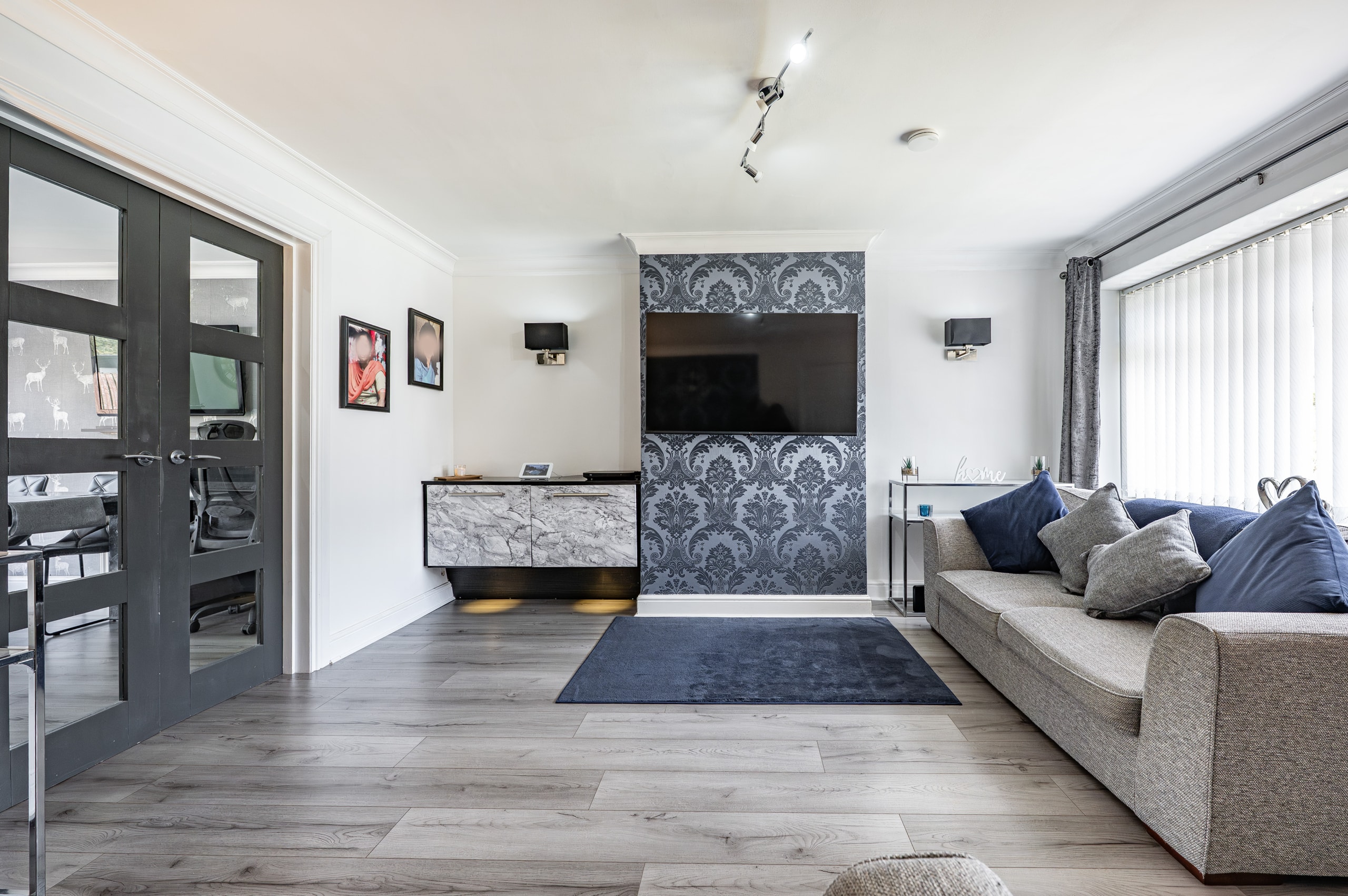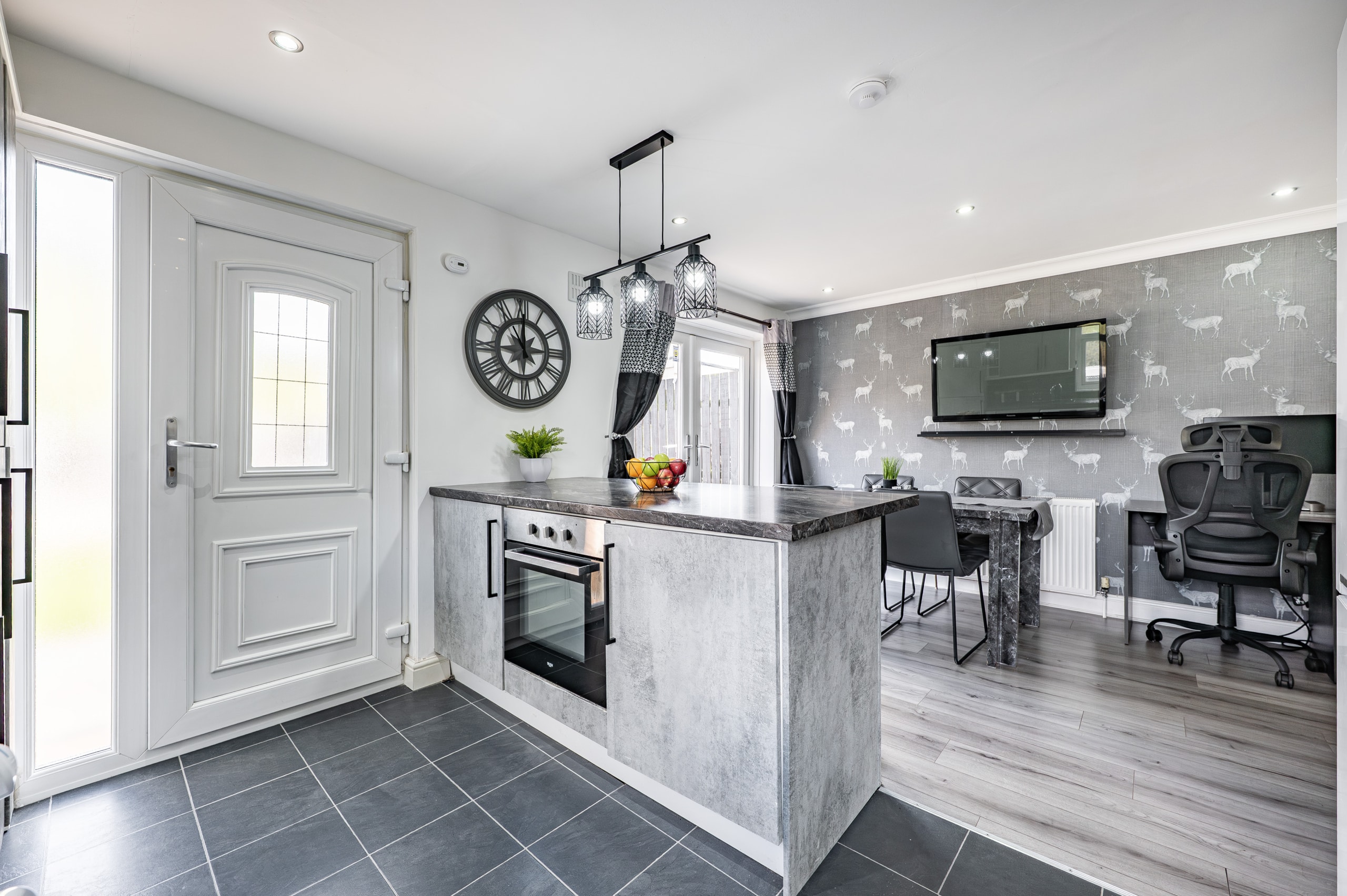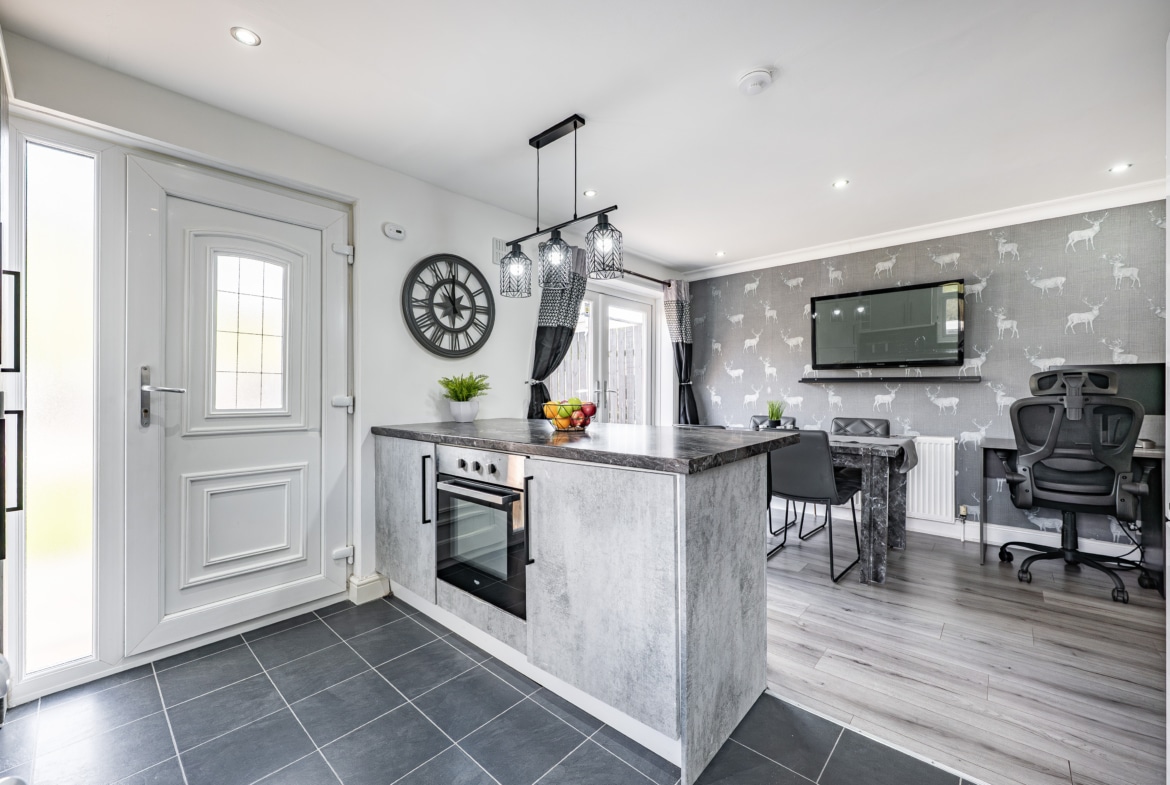The accommodation begins with a welcoming entrance hallway, with a staircase rising to the upper level. To the front, there is an impressive lounge featuring a useful under-stair storage cupboard and double doors leading through to a spacious dining kitchen. The kitchen is well-appointed with a range of base and wall-mounted units, an integrated oven, gas hob, and ample space for freestanding appliances. French doors open directly onto the rear garden, enhancing the sense of space and connection to the outdoors.