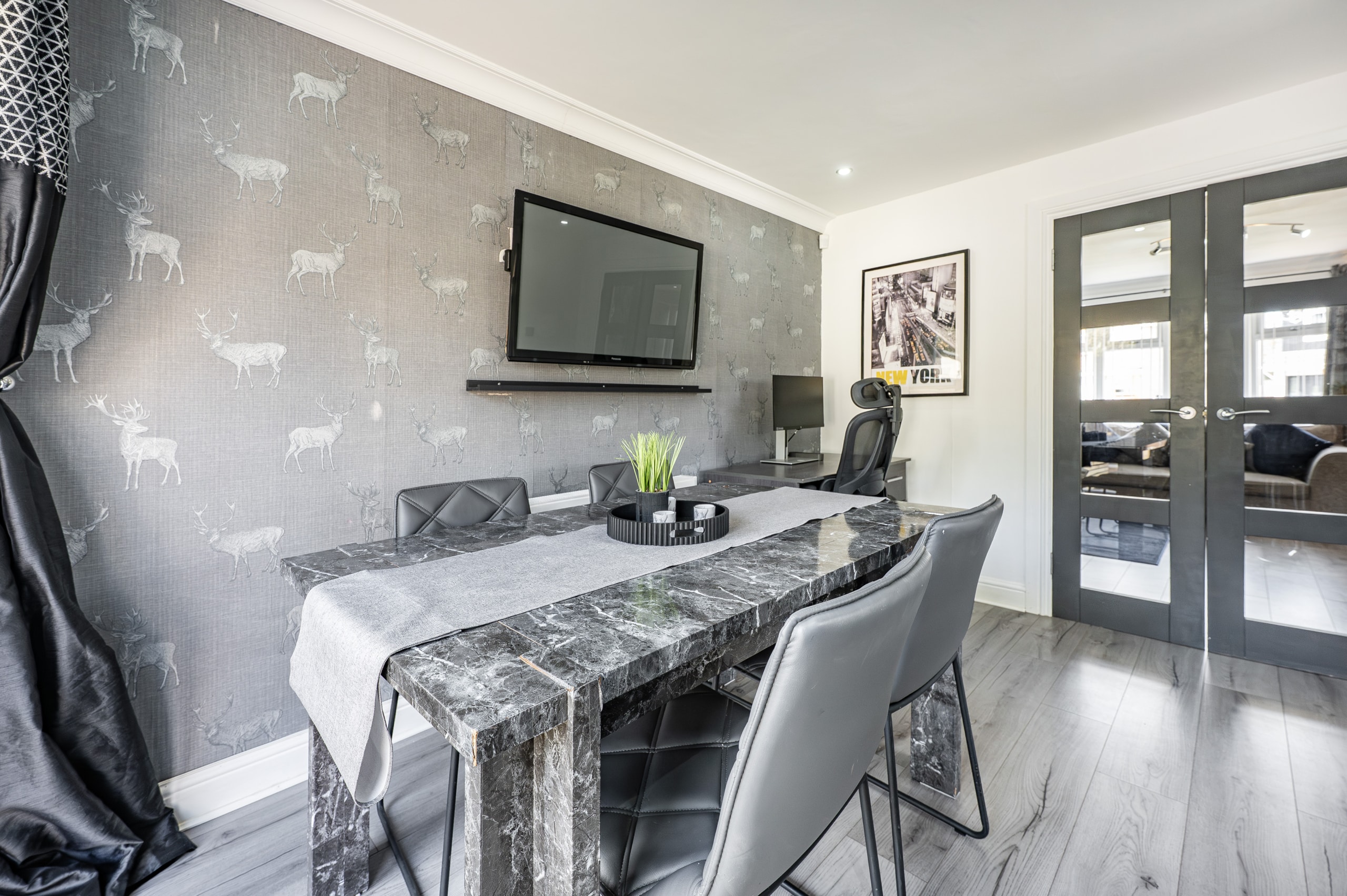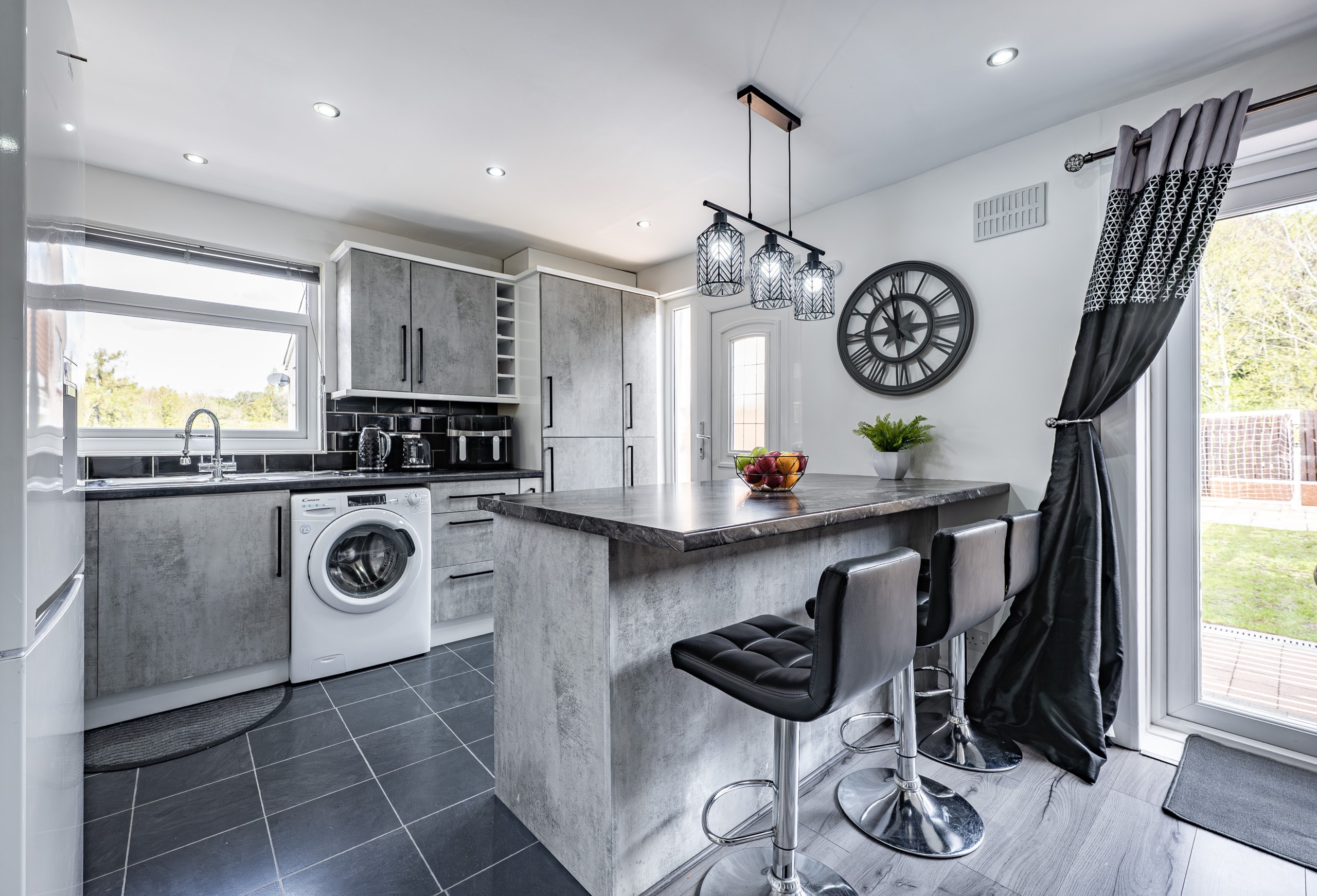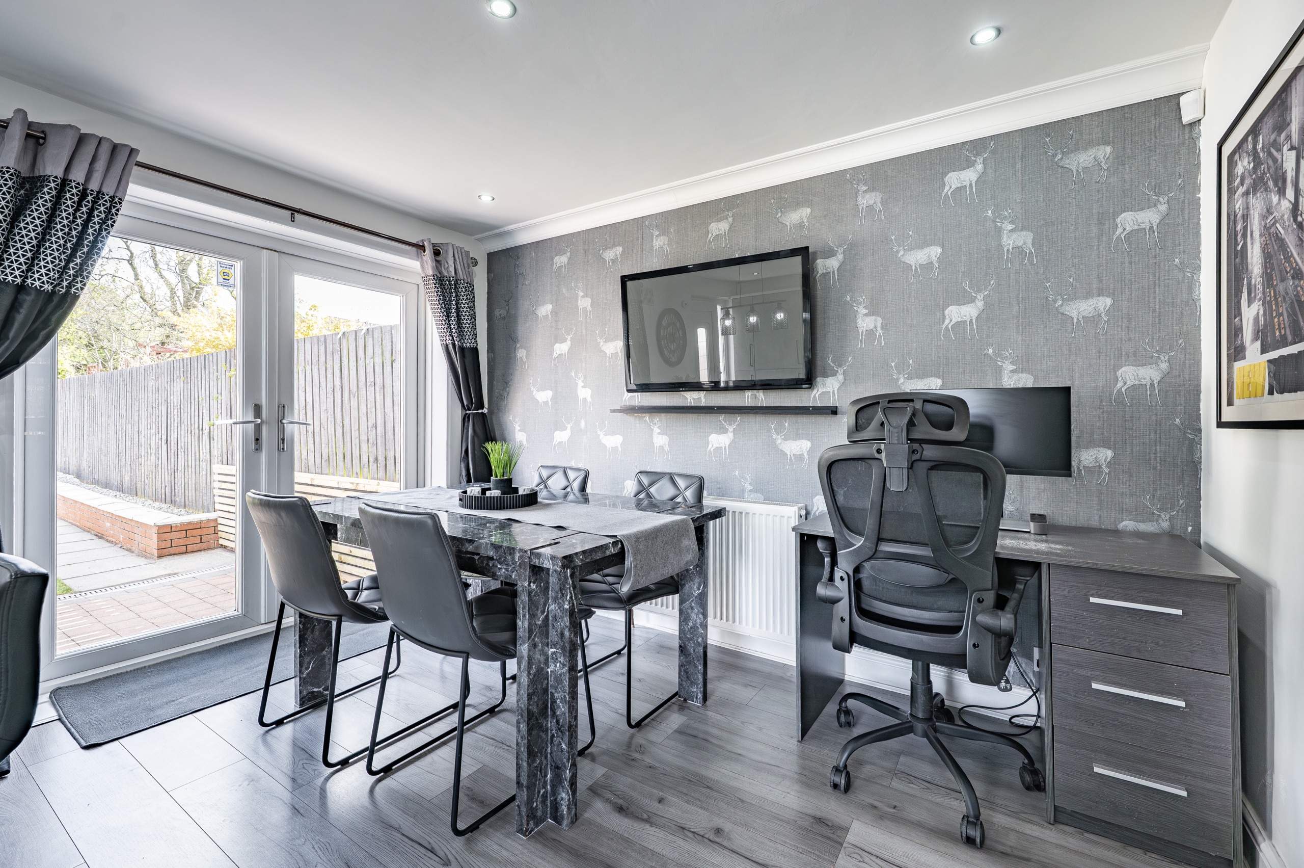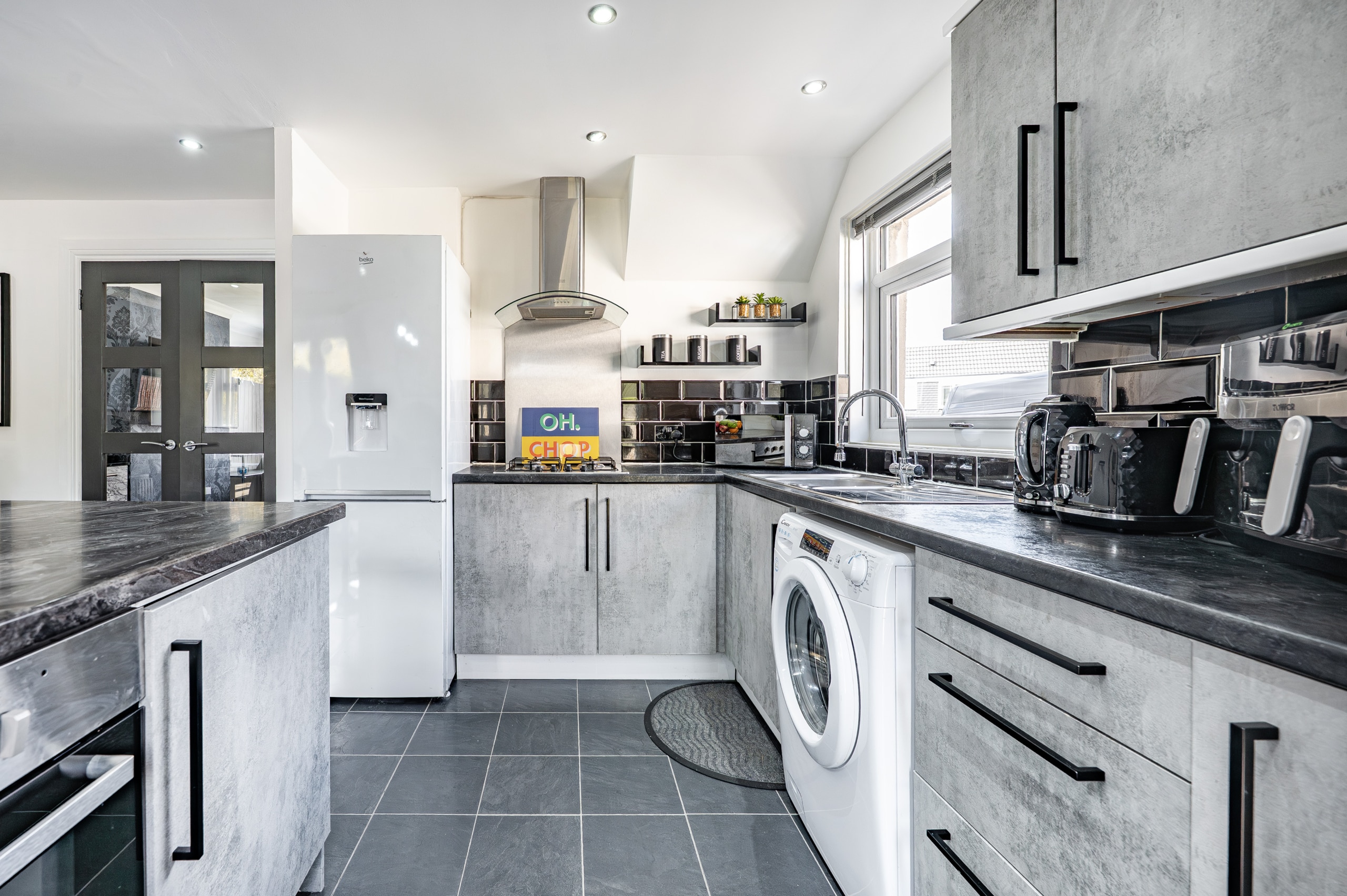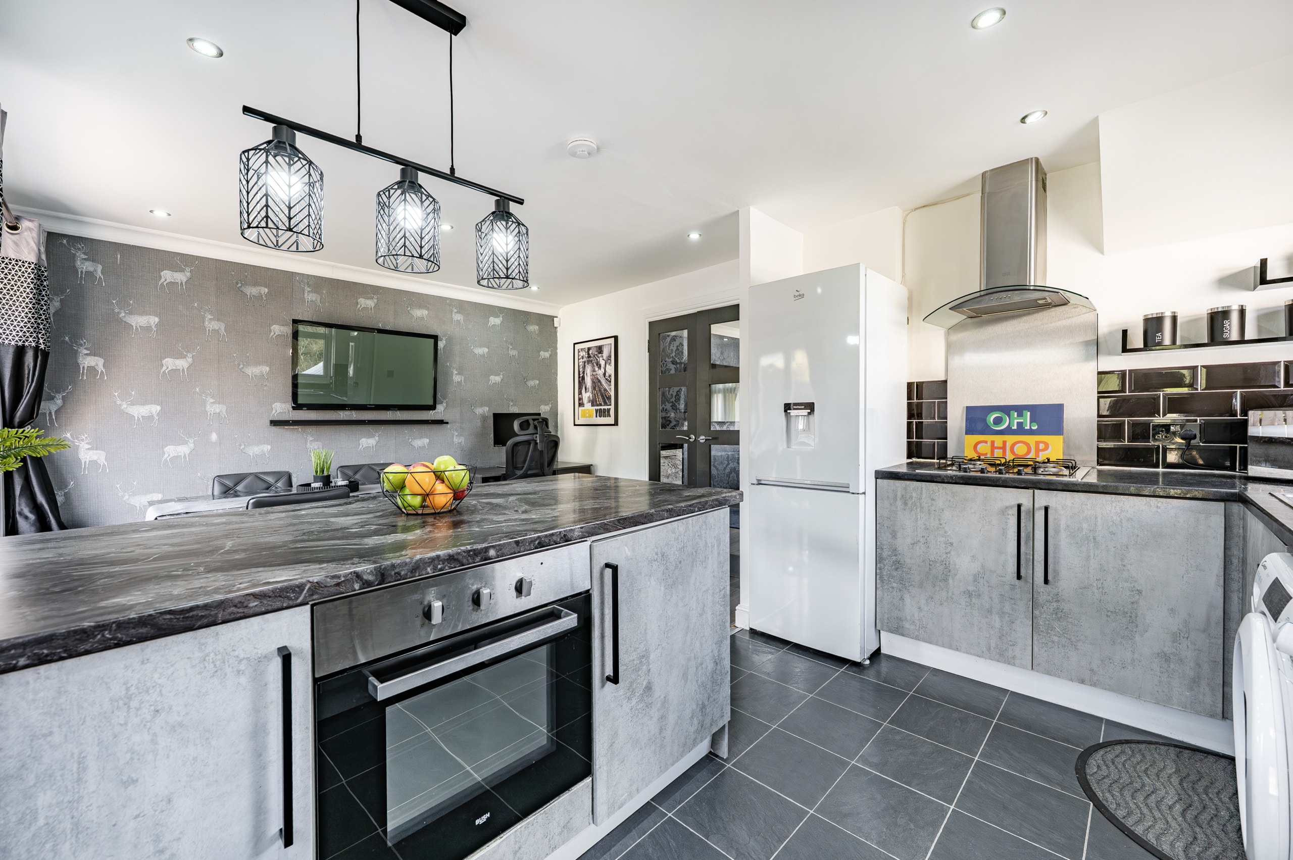 The accommodation begins with a welcoming entrance hallway, with a staircase rising to the upper level. To the front, there is an impressive lounge featuring a useful under-stair storage cupboard and double doors leading through to a spacious dining kitchen. The kitchen is well-appointed with a range of base and wall-mounted units, an integrated oven, gas hob, and ample space for freestanding appliances. French doors open directly onto the rear garden, enhancing the sense of space and connection to the outdoors.