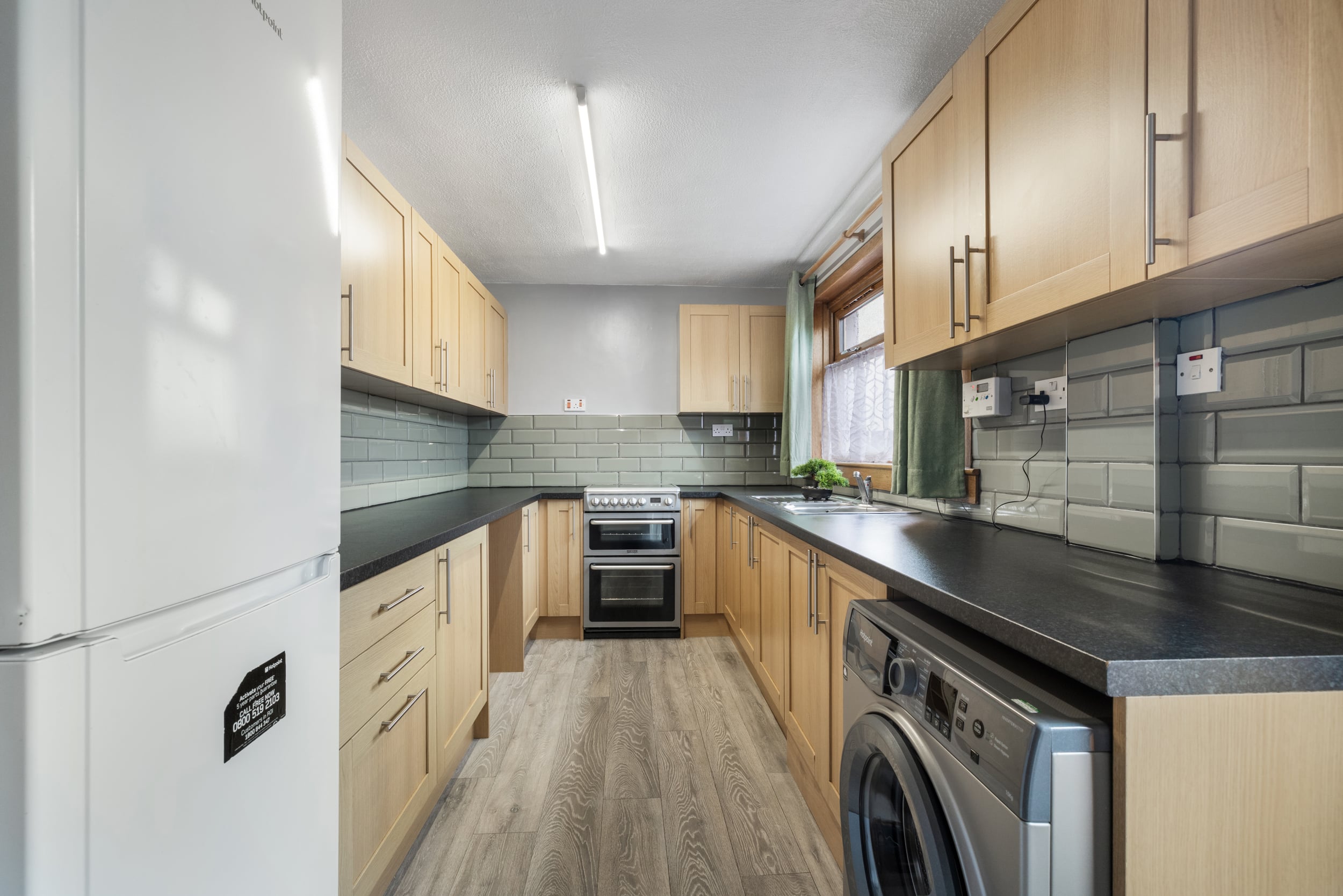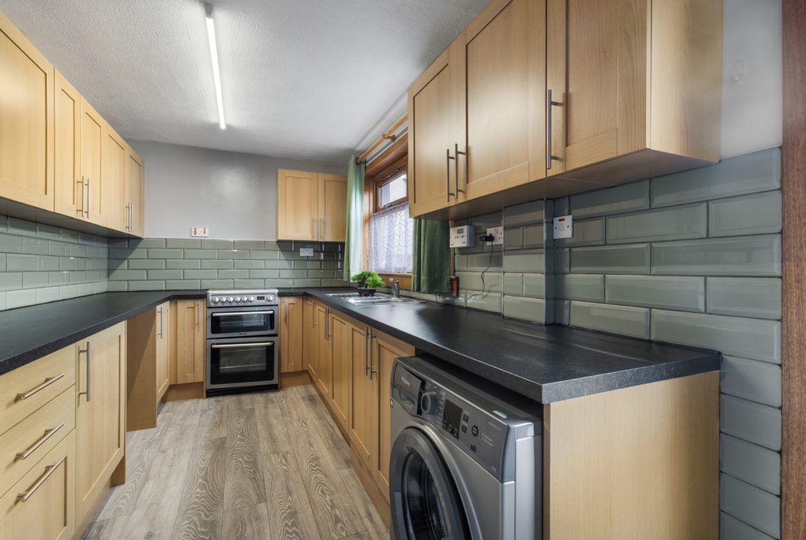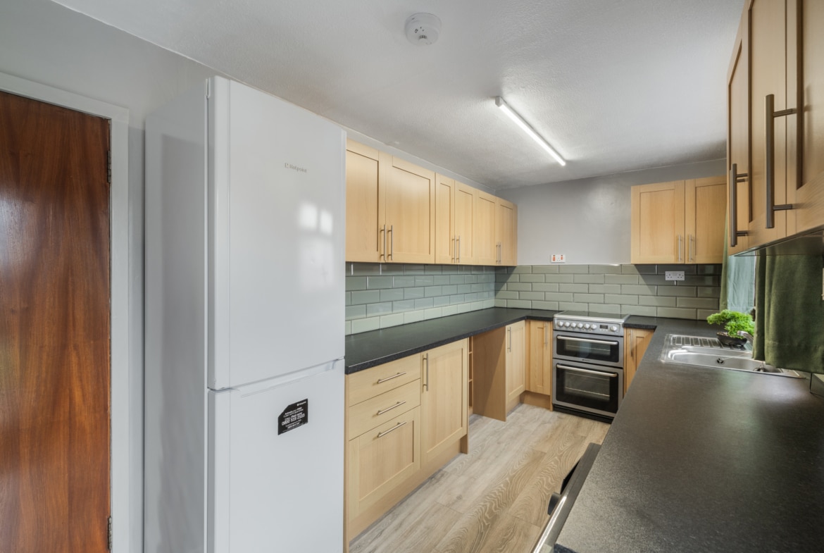 Set back from the road behind a neat, enclosed garden bordered with a low wall and shared driveway, the main entrance is tucked to the side of the property. You are welcomed into the property with a hallway which offers access to the living room, kitchen, and the fourth bedroom. The living room enjoys a bright south facing aspect and a generous footprint for various furniture configurations and boasts tasteful décor paired with a cosy carpet. Next door is the kitchen, fitted with a plethora of light wood base and wall mounted cabinets, a sweep of contrasting worktops, and cooker, freestanding washing machine and fridge/freezer, there is direct access to the enclosed rear garden.