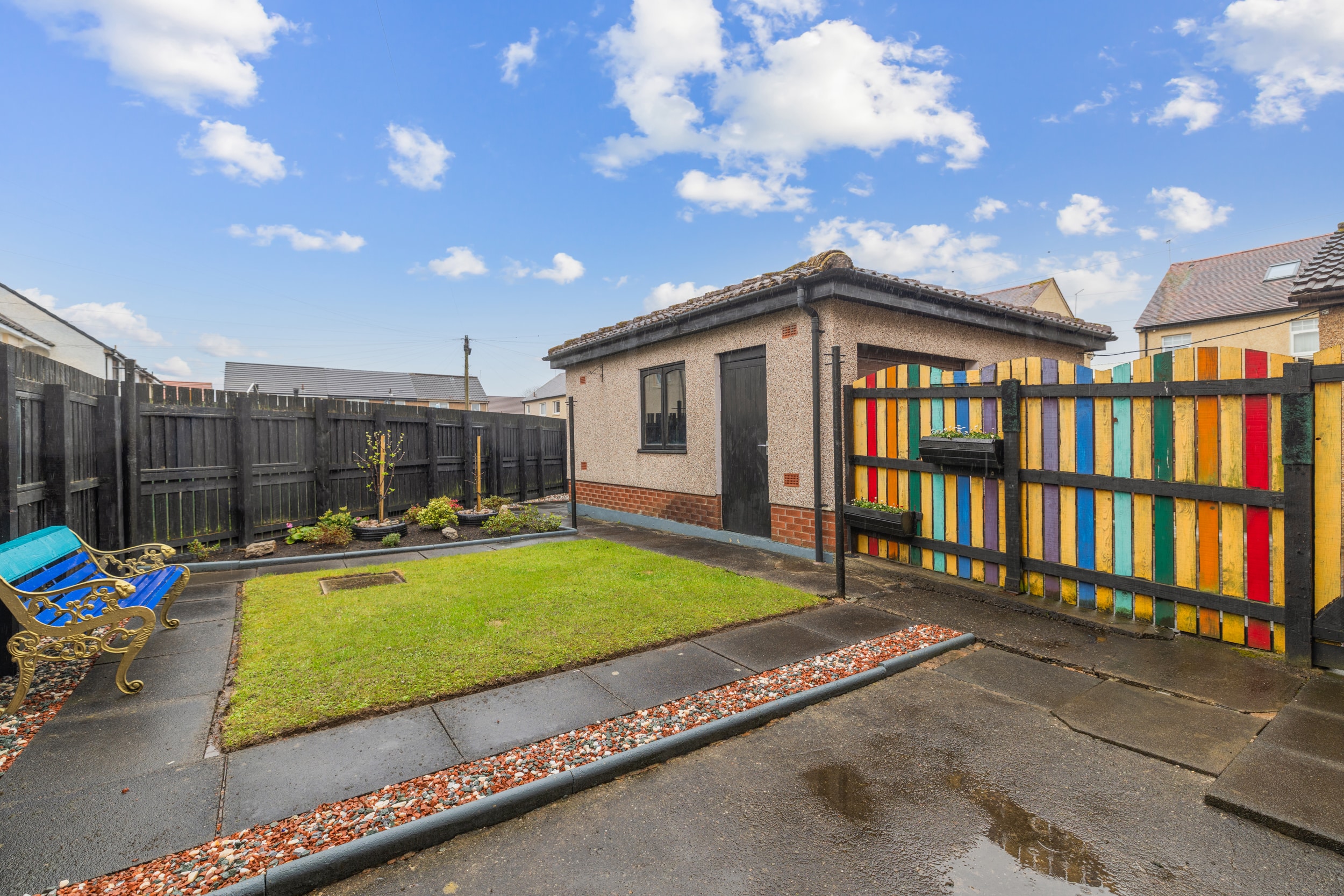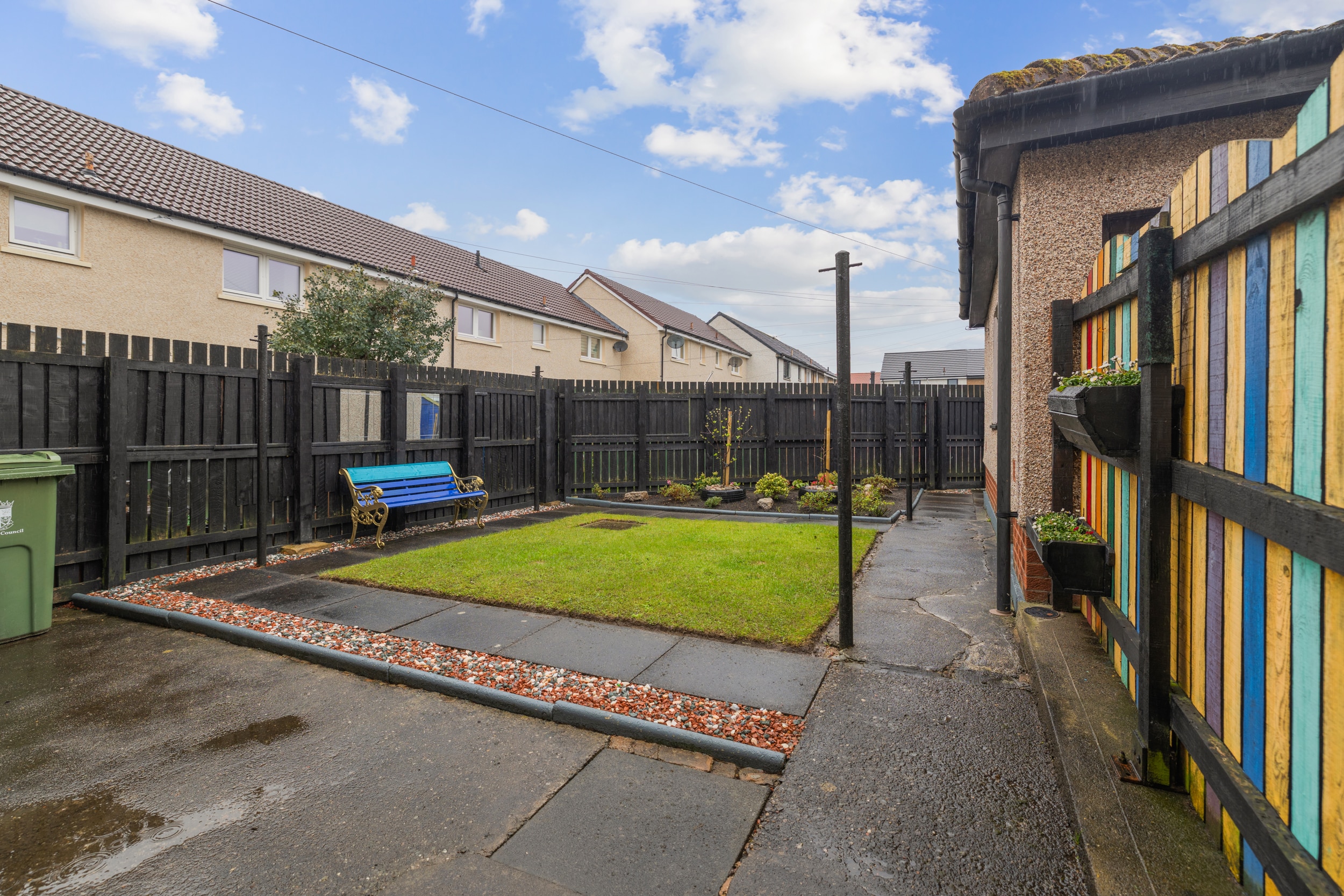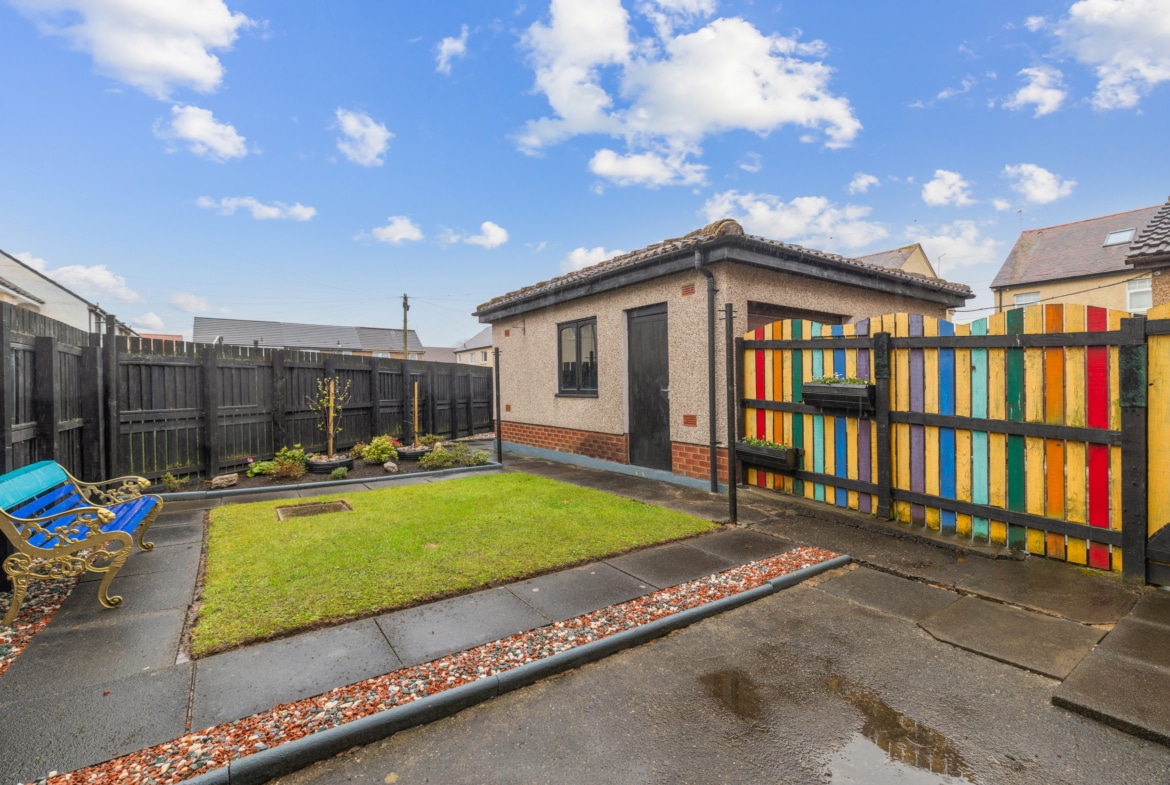 In addition to the neat front garden, shared drive leading to a single garage. The rear fully enclosed garden has been landscaped to include paved patio areas, manicured lawn bordered by chips, shrubs, and plants. The fenced perimeter provides a safe environment for both children and pets.