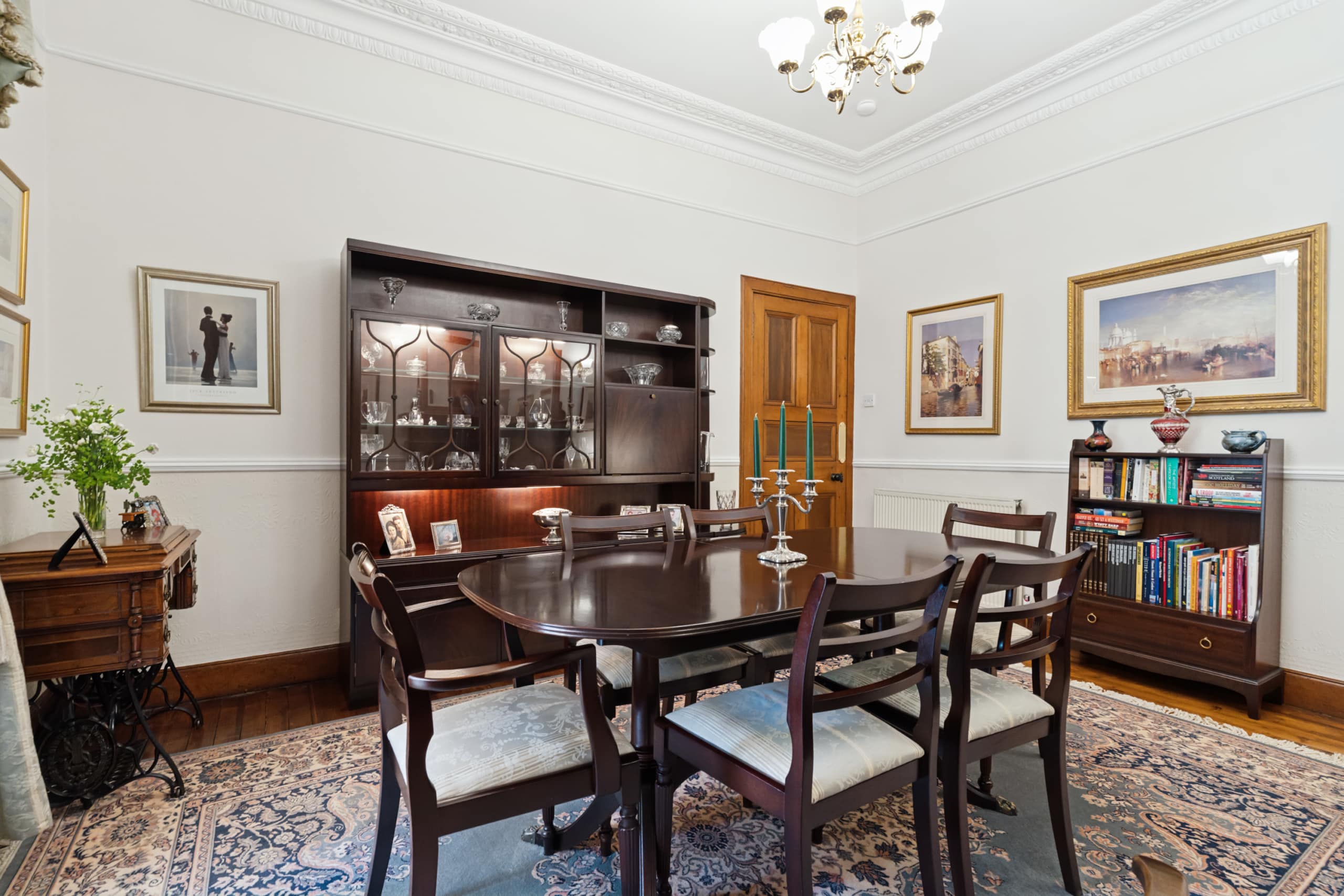 Elevated back from the road and affording breath-taking views of the River Forth, the home’s front door opens into a handy vestibule with storage and traditional tiled flooring followed by an impressive, traditional reception hall providing access to the ground floor accommodation. On your left, the generous living room instantly catches the eye with its inviting décor and large bay window, framing the expansive waterfront view. A beautiful, traditional fireplace, insert with a fire provides the room with a focal point for arranging lounge furniture, whilst period cornicing and ceiling rose retain the traditional features. Next door is the formal dining room, a well-proportioned public room which is currently set up as a dining room, however, could be a cosy family room with an imposing fireplace creating a focal point. The kitchen is adjacent and is fitted with a plethora of classic styled wooden cabinets, framed by a sweep of work tops, integrated double oven, microwave oven, gas hob, fridge/freezer, washing machine, and space for a dishwasher. The flooring is Amtico which flows seamlessly through to the impressive conservatory. Spanning almost the width of the property is the sun-drenched conservatory, forming a third reception area delivering delightful views of the rear garden, and a relaxing space to enjoy your morning coffee or a family lunch. Completing the ground floor is the shower room with separate cloakroom featuring a toilet, and sink.