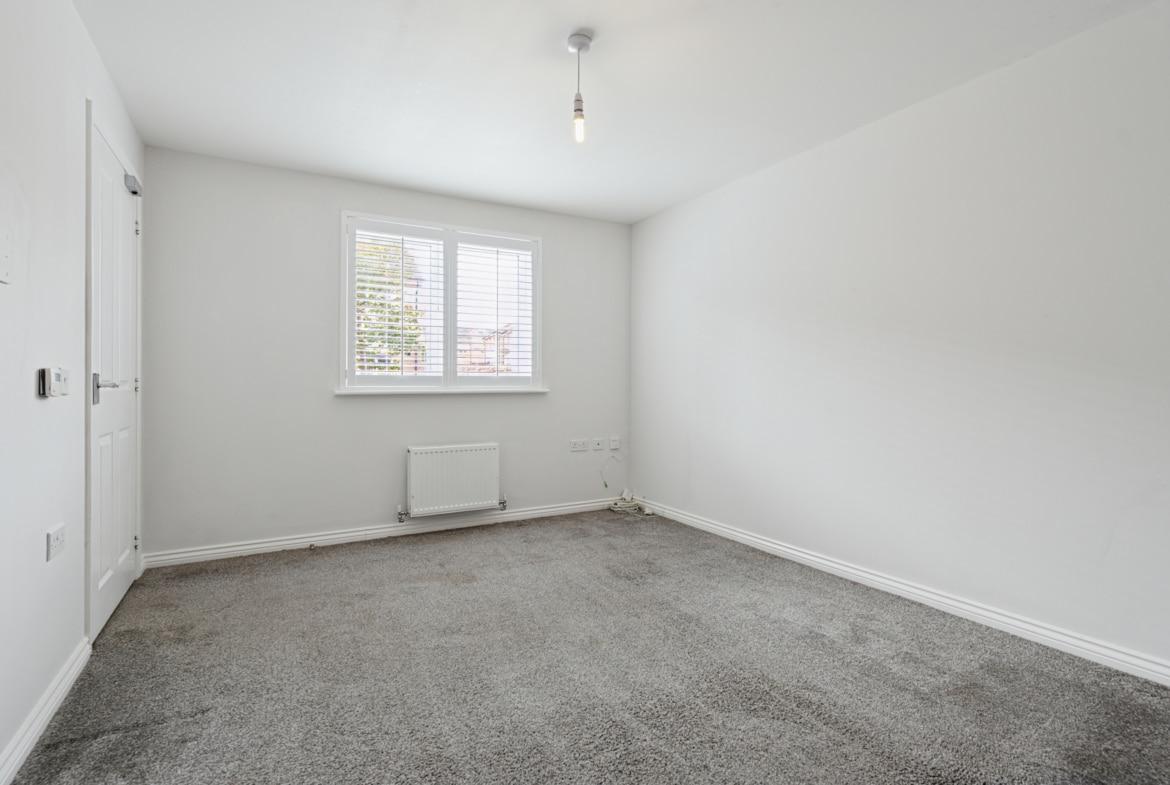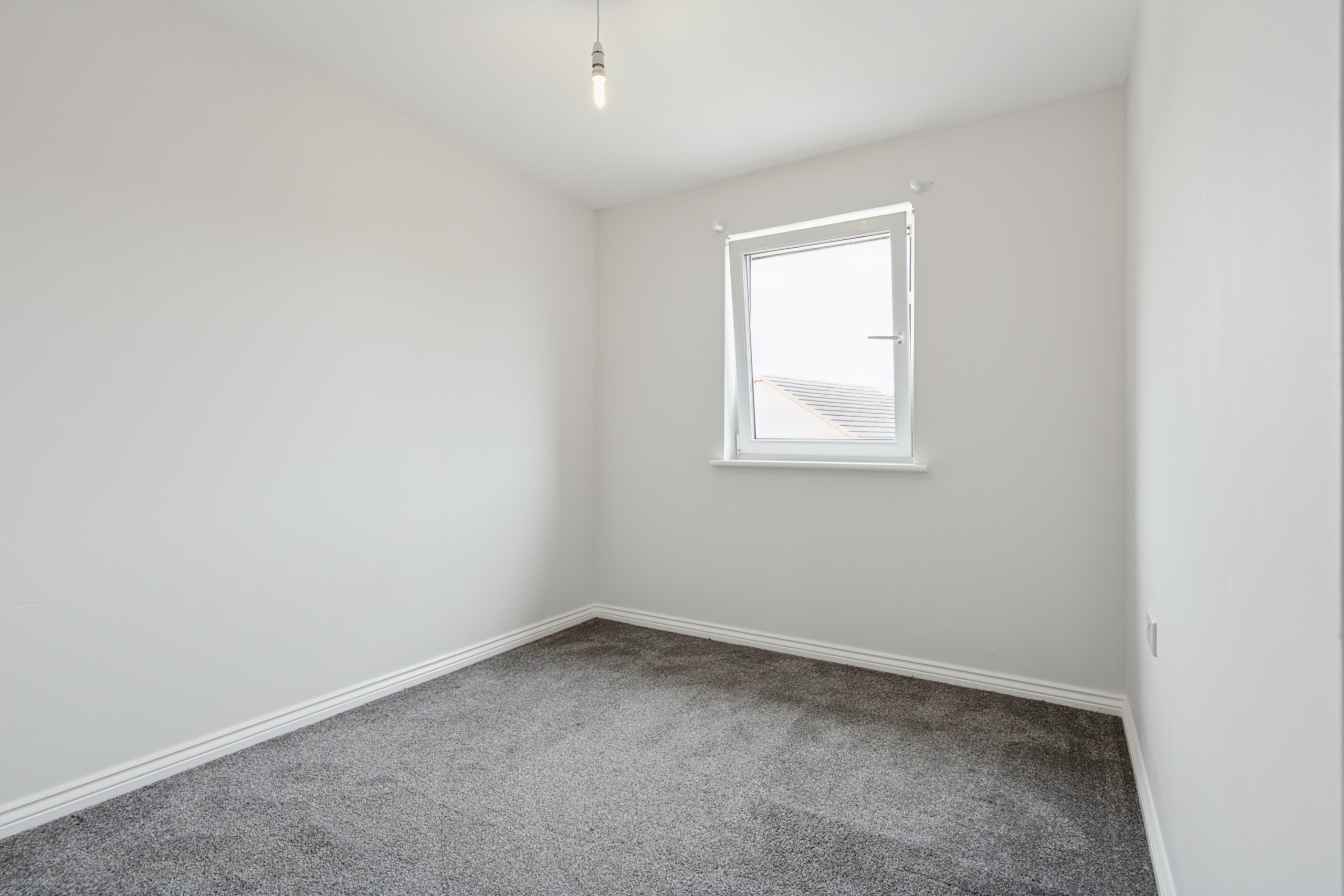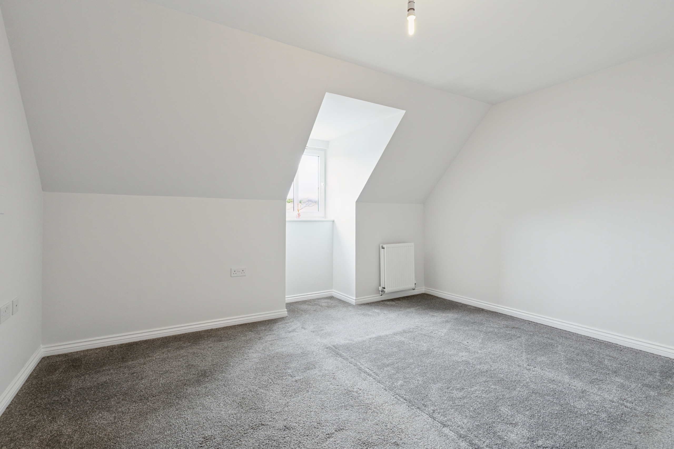 A carpeted staircase takes you to the first floor where there are three sizeable bedrooms, all with grey carpet, white walls and space for a bed, and freestanding bedroom furniture. The family bathroom is fitted with a white three-piece suite comprising bath with tiles surrounding it, toilet, and sink.
