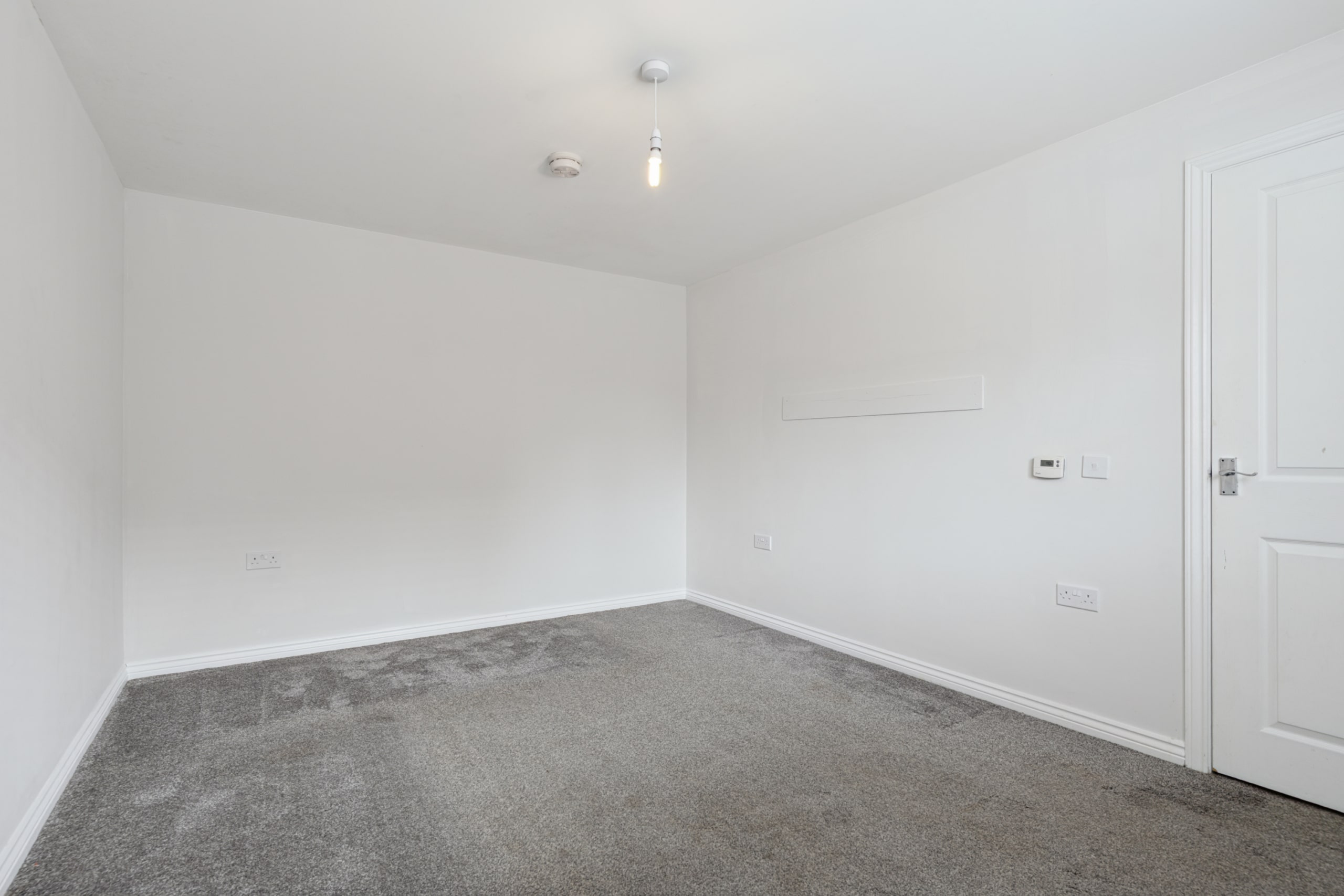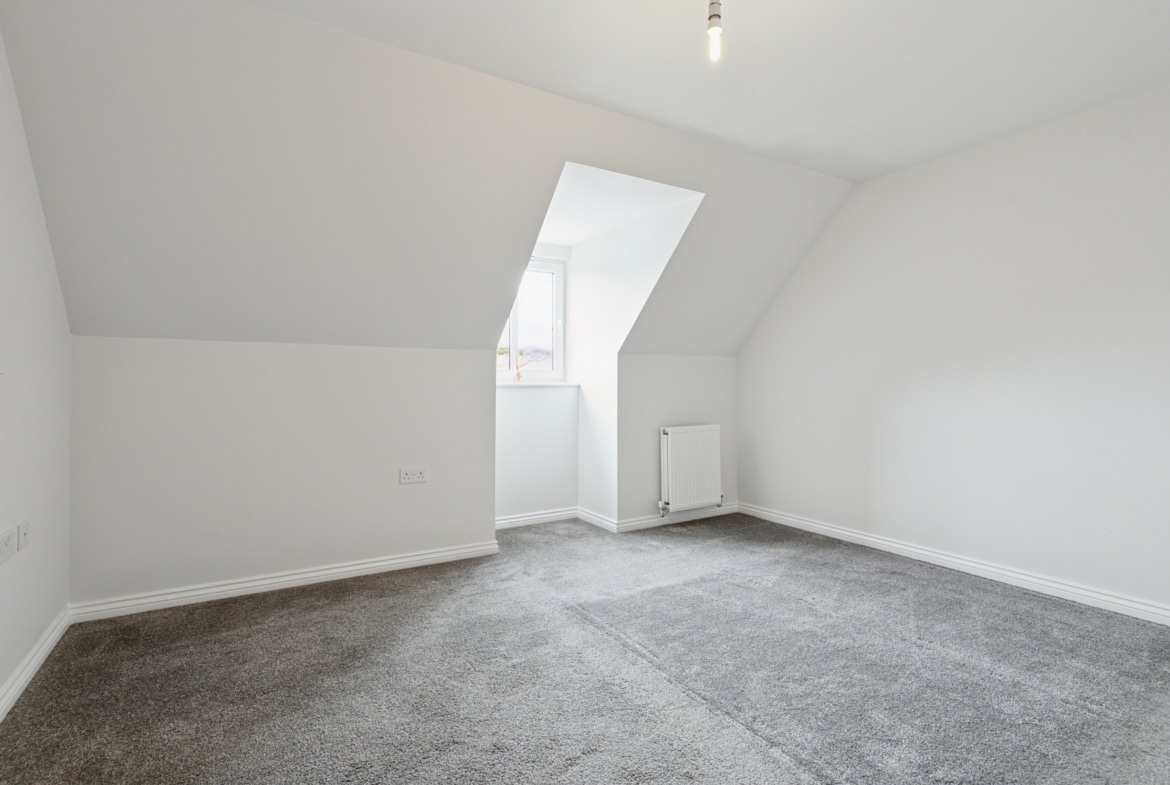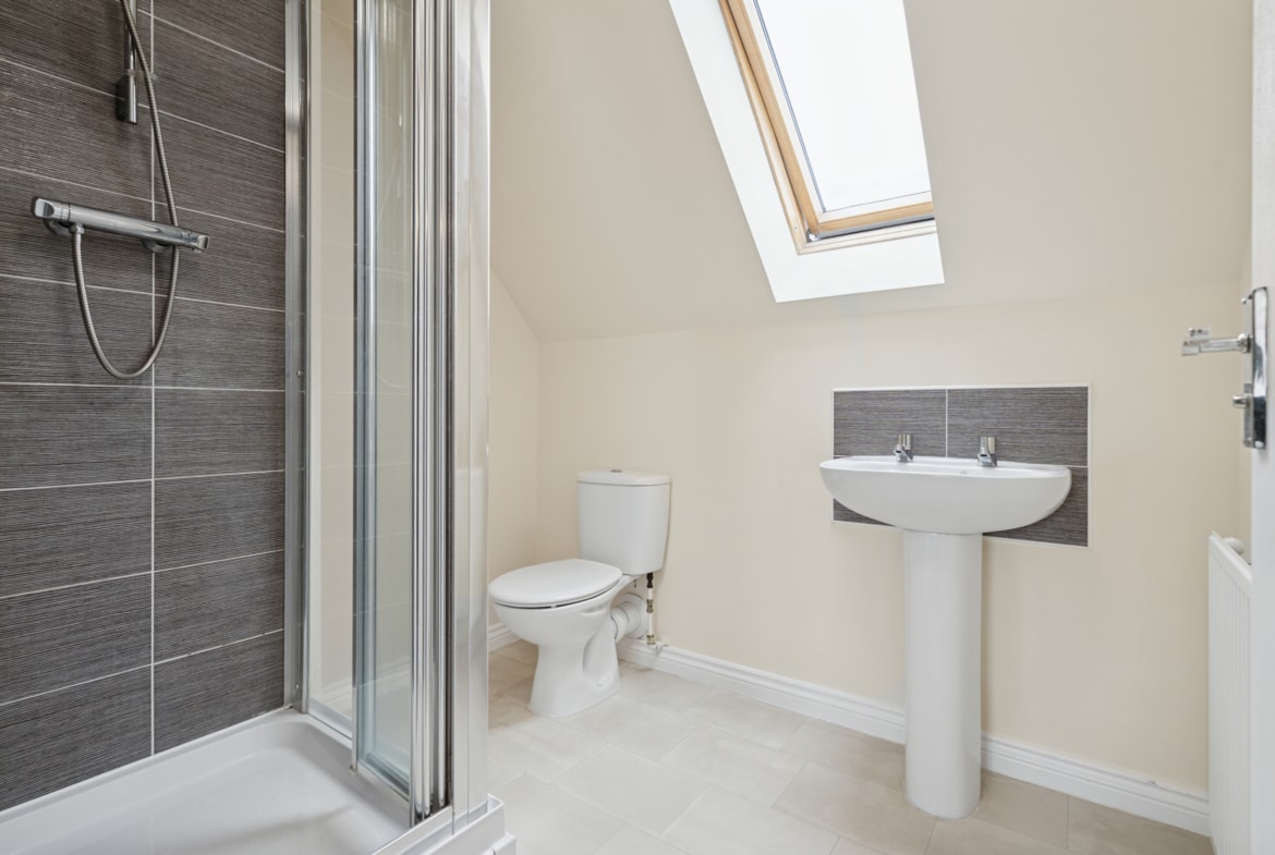 A carpeted staircase takes you to the first floor where there are three sizeable bedrooms, all with grey carpet, white walls and space for a bed, and freestanding bedroom furniture. The family bathroom is fitted with a white three-piece suite comprising bath with tiles surrounding it, toilet, and sink.