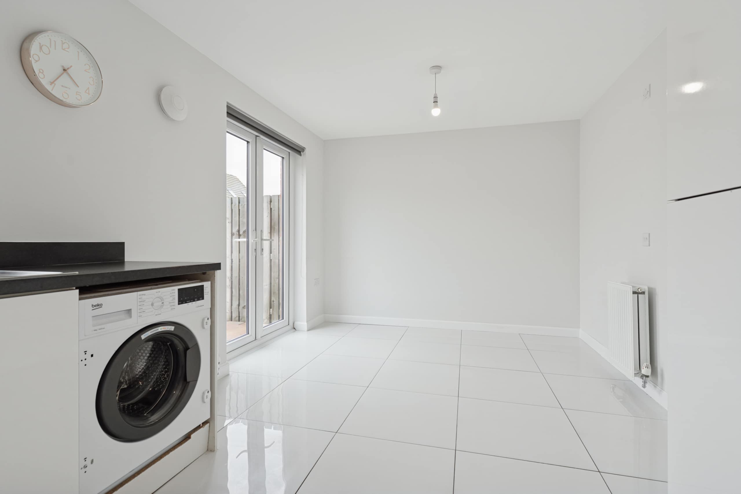 The front door swings open into a welcoming hallway with stylish white walls and white floor tiles, on your left you are drawn into the living room a sizeable room offering space for various furniture configurations, neutral décor paired with plush grey carpet. At the end of the hallway, you step into the impressive open plan modern kitchen and dining area, the kitchen area is fitted with white gloss base and wall mounted cabinets, integrated electric oven, gas hob, fridge/freezer, and washing machine (sold as seen, no guarantees given). The dining area offers space for a large table and chairs where family meals can be enjoyed with views and access across the rear garden through French Doors. Completing the ground floor accommodate is the under-stair cupboard and cloakroom with toilet, and sink.