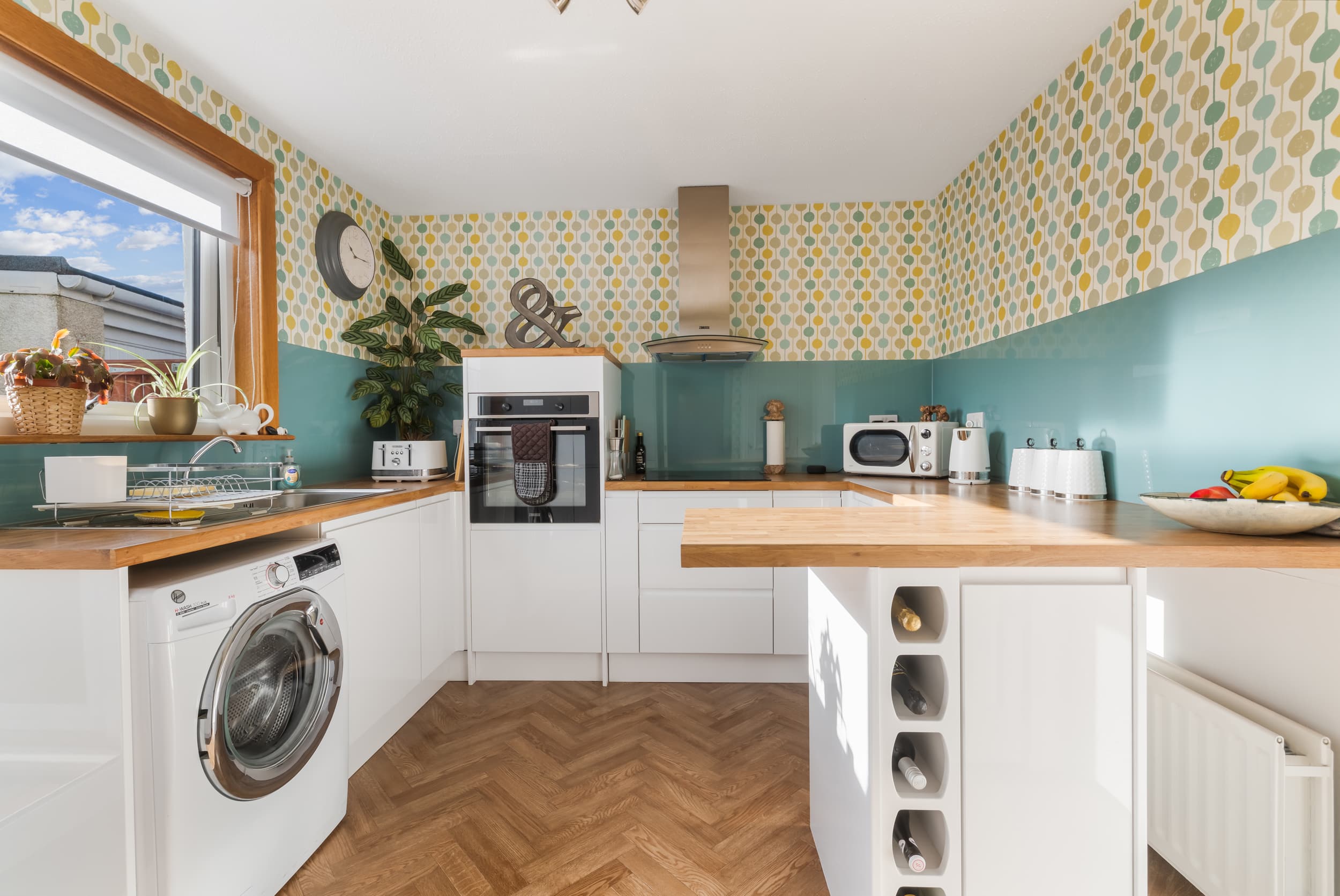Completing the ground floor accommodation is the contemporary fitted kitchen, boasting sleek white gloss handleless cabinets framed by a sweep of contrasting worktops, eye level integrated electric oven, induction hob, fridge, freezer, and space for a washing machine.